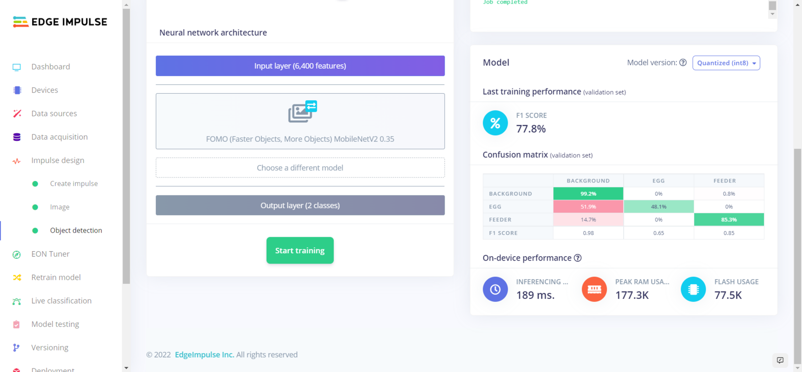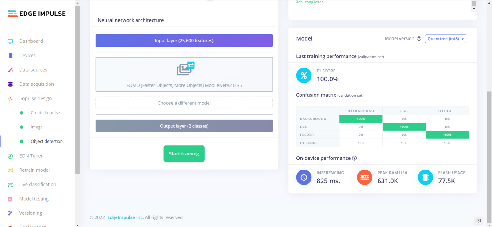Step 5.2: Training the FOMO model on quail eggs and poultry feeder status