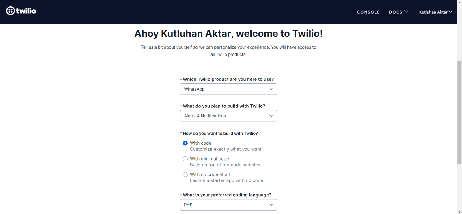 To get notification messages over WhatsApp, I utilized Twilio’s API for WhatsApp. Twilio gives the user a simple and reliable way to send WhatsApp messages to a verified phone number free of charge. Also, Twilio provides official helper libraries for different programming languages, including PHP. :hash: First of all, sign up for Twilio and create a new free trial account (project).