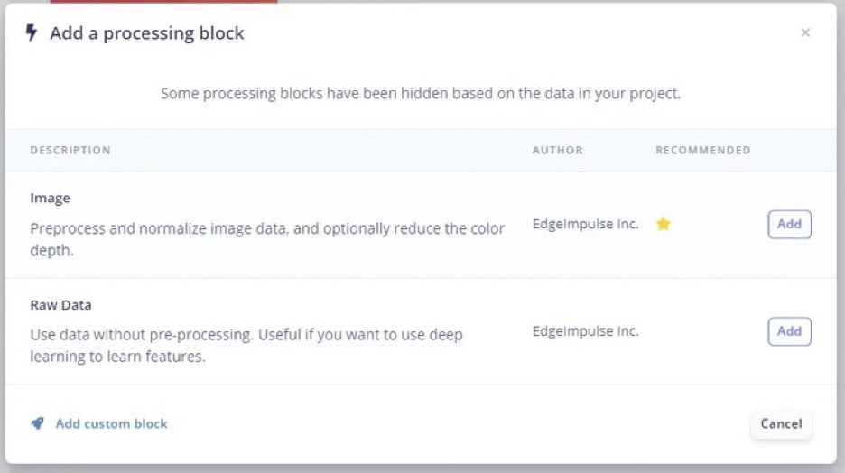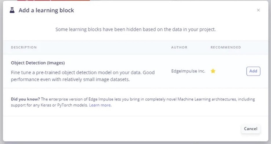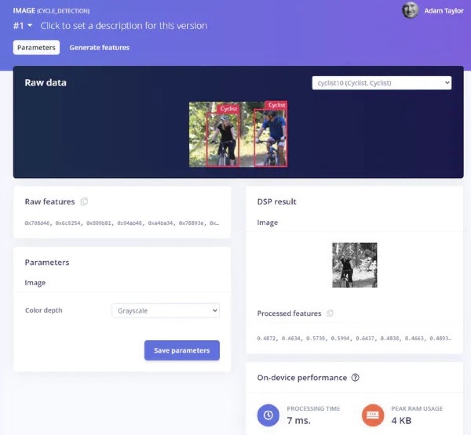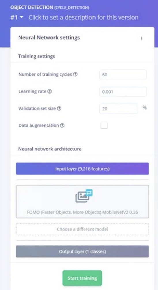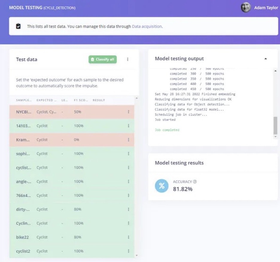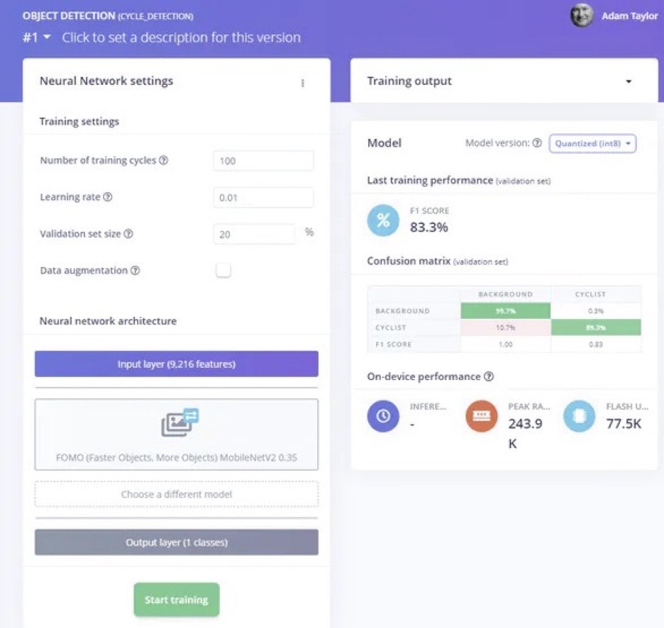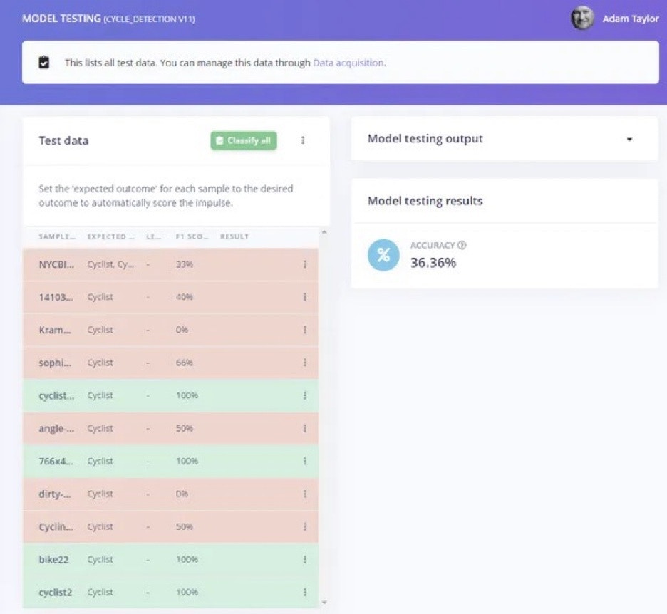 Like with all ML/AI projects, one of the largest challenges is in collecting a dataset. There is not a large, publicly available, dataset so we started to collect a small dataset to enable training and proof of concept. If the concept works we can create a larger dataset which addresses more conditions such as low light, weather, etc. The initial dataset used consisted of 100 images of cyclists in different conditions tagged from around the world. These images were collected from open source images available across the web. Once the dataset is collected we are able to create the Edge Impulse project.Edge Impulse Project