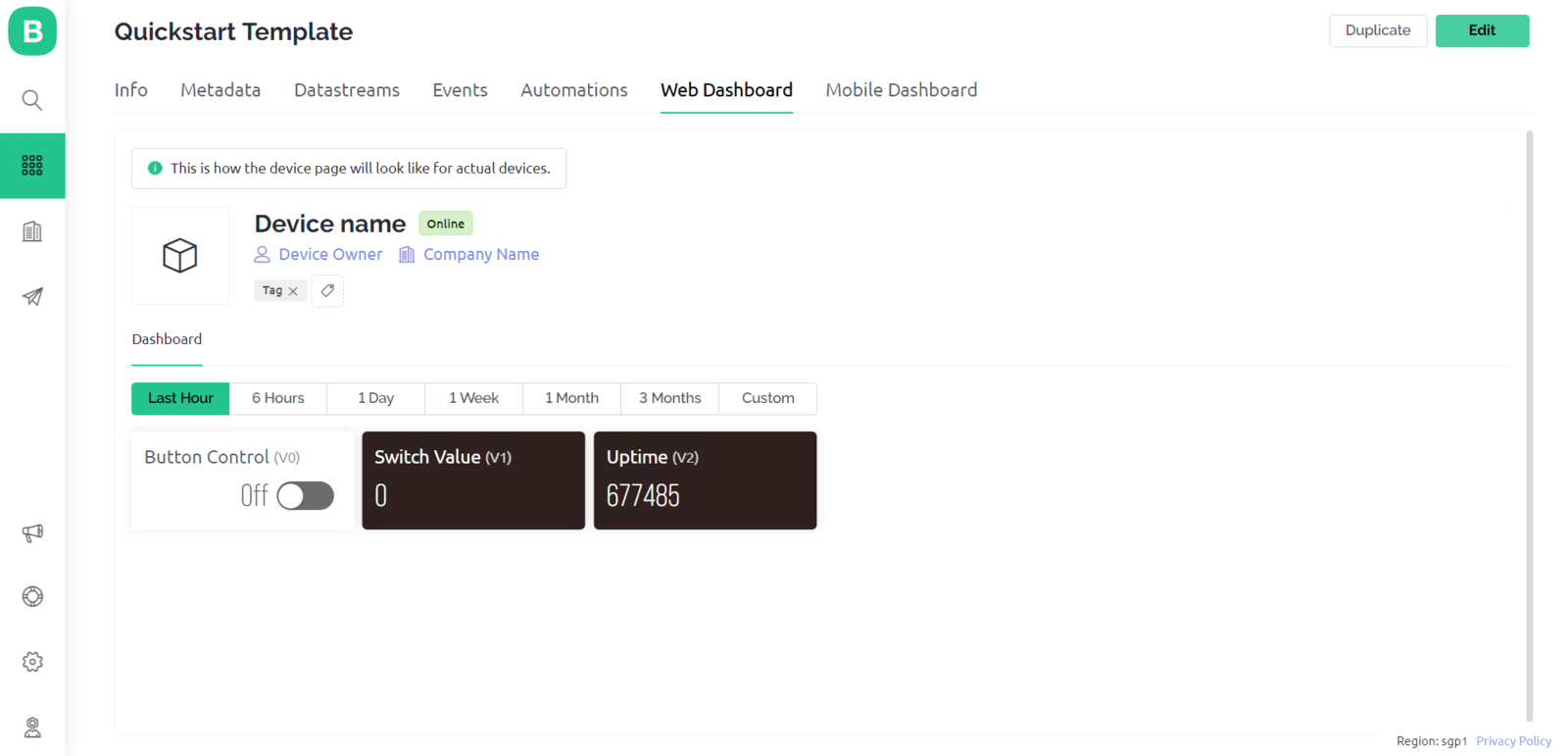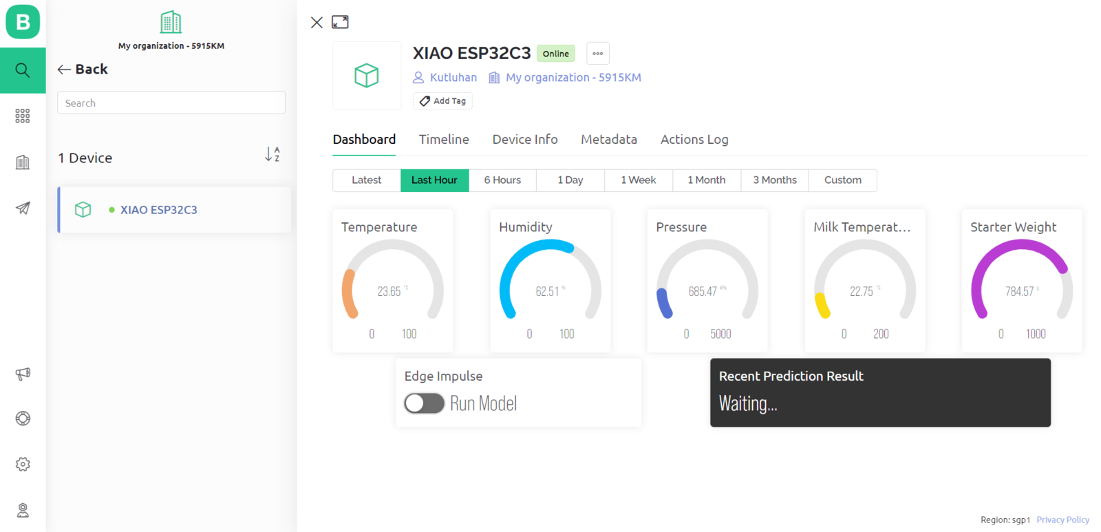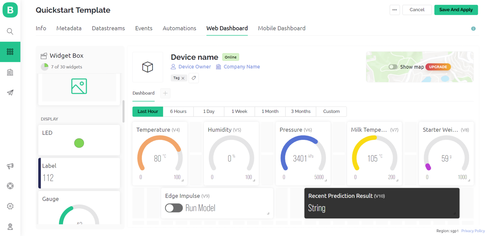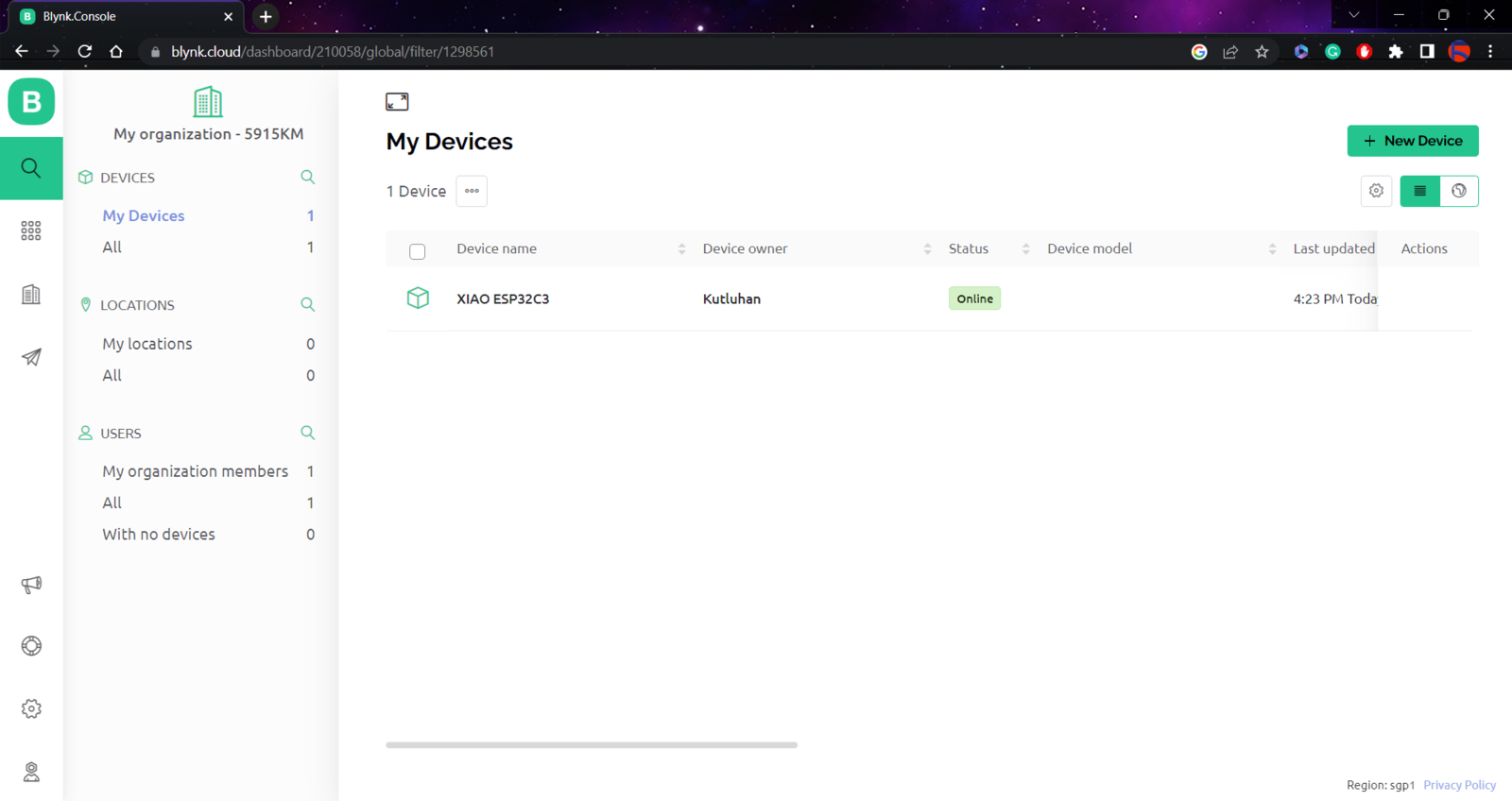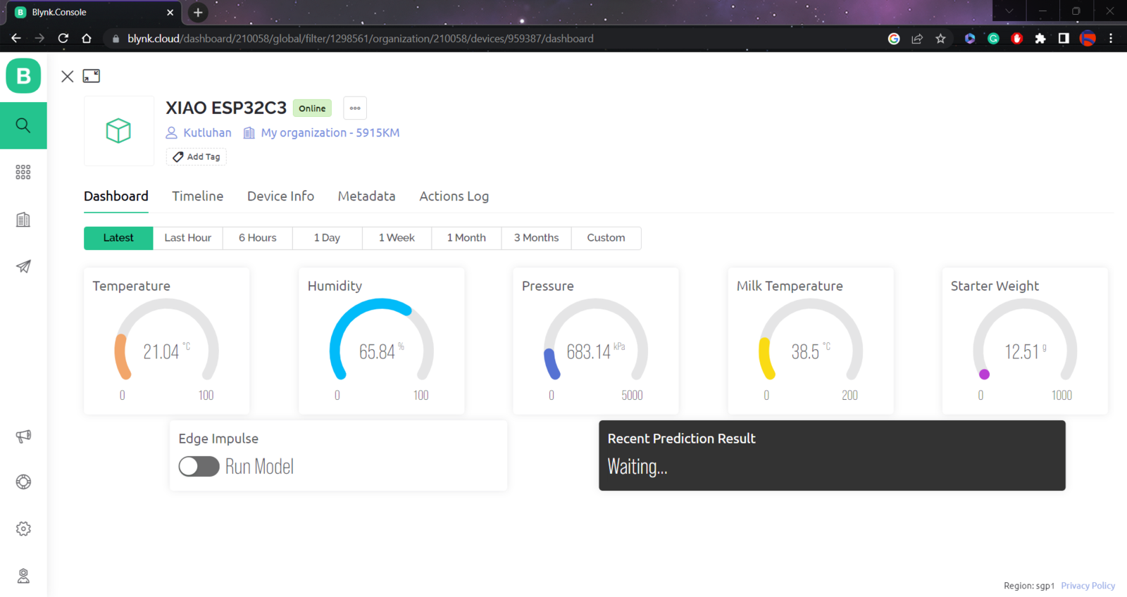 Since I focused on building an accessible device, I decided to create a complementing Blynk application for allowing the user to display recent sensor readings, run the Edge Impulse neural network model, and get informed of the prediction result remotely. The Blynk IoT Platform provides a free cloud service to communicate with supported microcontrollers and development boards, such as ESP32C3. Also, Blynk lets the user design unique web and mobile applications with drag-and-drop editors. :hash: First of all, create an account on Blynk and open Blynk.Console.