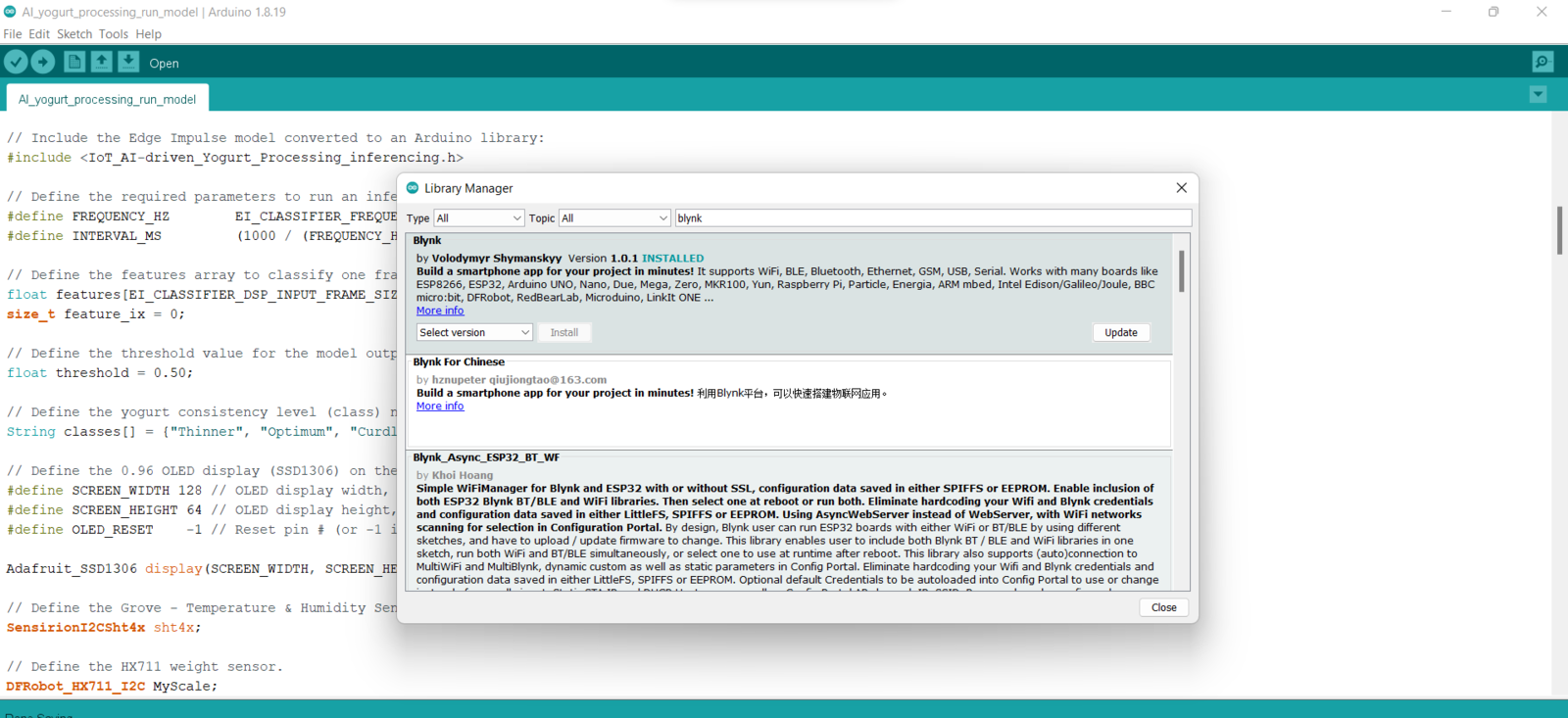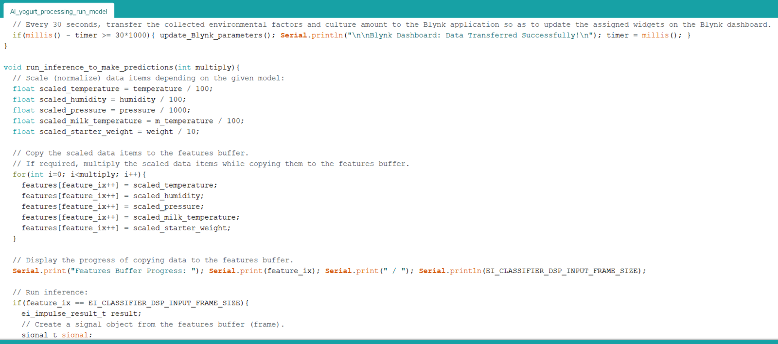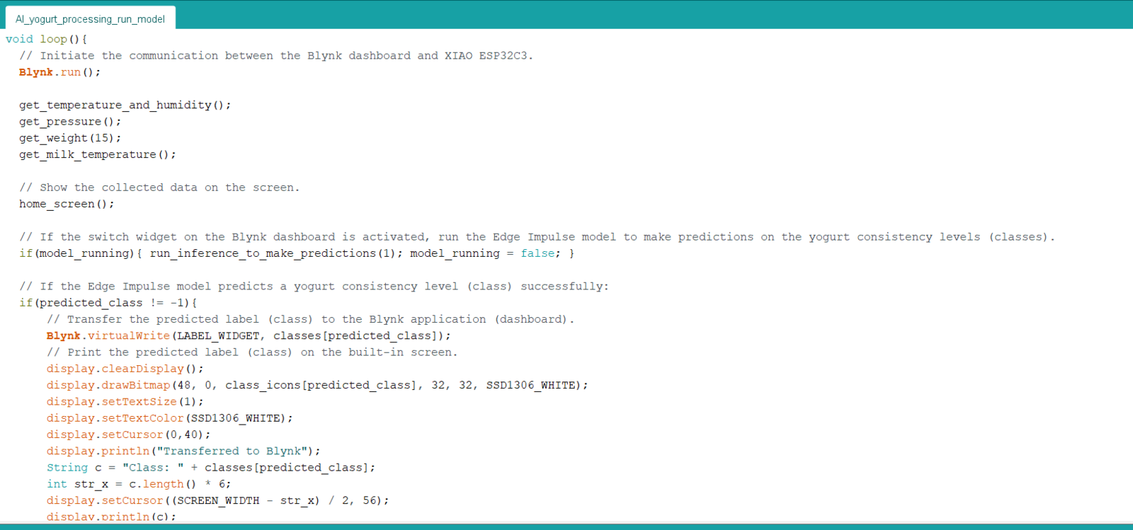 After building, training, and deploying my model as an Arduino library on Edge Impulse, I needed to upload the generated Arduino library on XIAO ESP32C3 to run the model directly so as to create an easy-to-use and capable device operating with minimal latency, memory usage, and power consumption. Since Edge Impulse optimizes and formats signal processing, configuration, and learning blocks into a single package while deploying models as Arduino libraries, I was able to import my model effortlessly to run inferences. :hash: After downloading the model as an Arduino library in the ZIP file format, go to Sketch ➡ Include Library ➡ Add .ZIP Library… :hash: Then, include the IoT_AI-driven_Yogurt_Processing_inferencing.h file to import the Edge Impulse neural network model.- Blynk Switch Button ➡ Run Inference