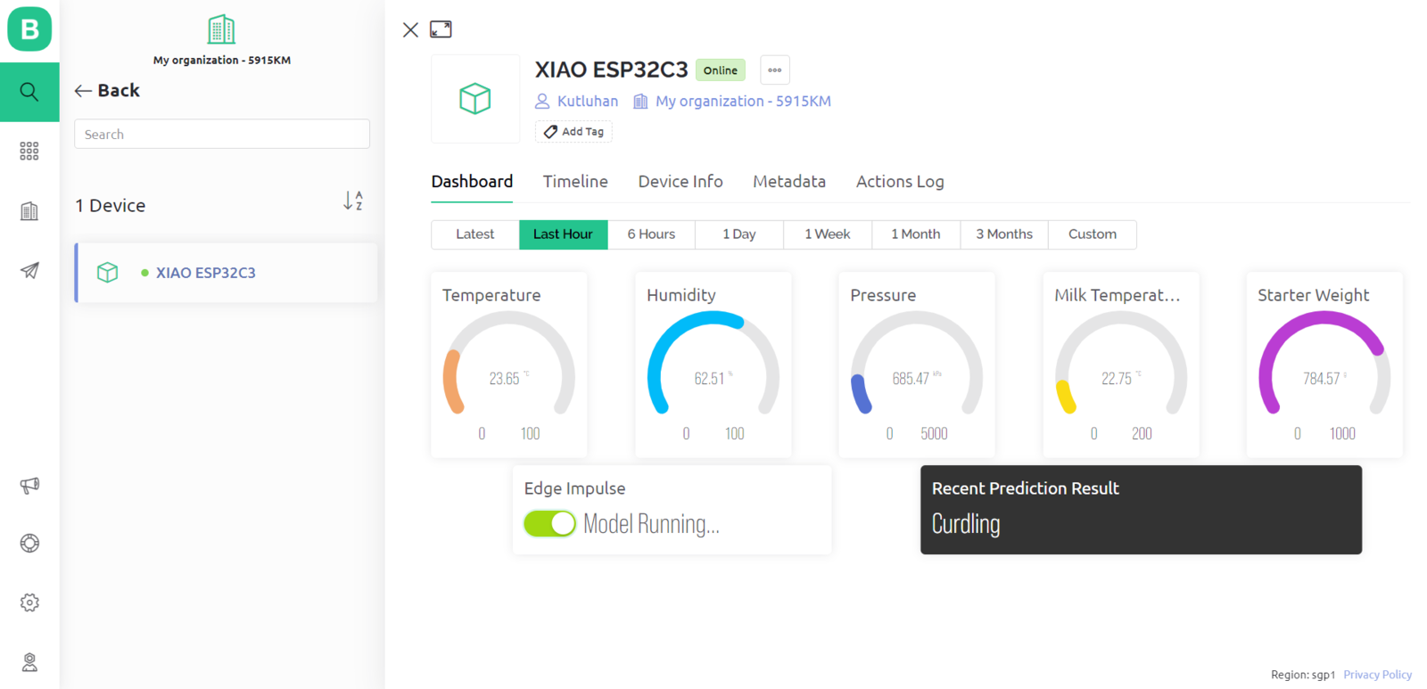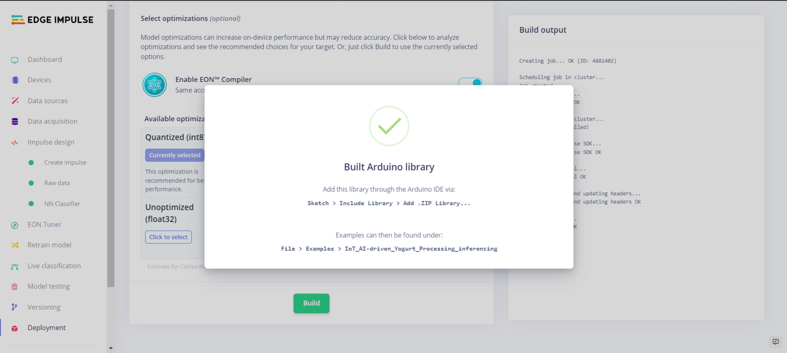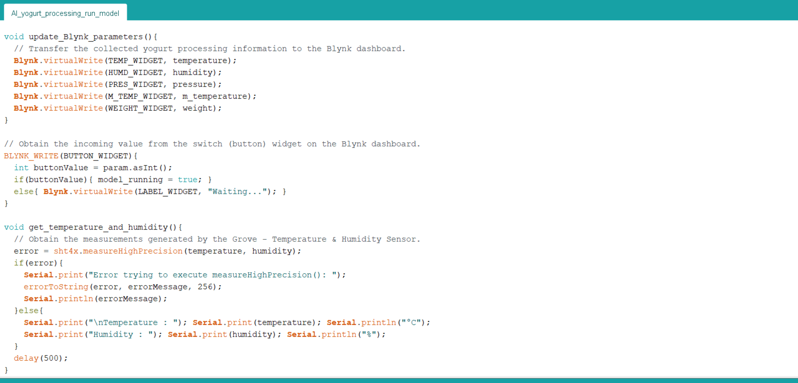 After building, training, and deploying my model as an Arduino library on Edge Impulse, I needed to upload the generated Arduino library on XIAO ESP32C3 to run the model directly so as to create an easy-to-use and capable device operating with minimal latency, memory usage, and power consumption. Since Edge Impulse optimizes and formats signal processing, configuration, and learning blocks into a single package while deploying models as Arduino libraries, I was able to import my model effortlessly to run inferences. :hash: After downloading the model as an Arduino library in the ZIP file format, go to Sketch ➡ Include Library ➡ Add .ZIP Library… :hash: Then, include the IoT_AI-driven_Yogurt_Processing_inferencing.h file to import the Edge Impulse neural network model.- Blynk Switch Button ➡ Run Inference