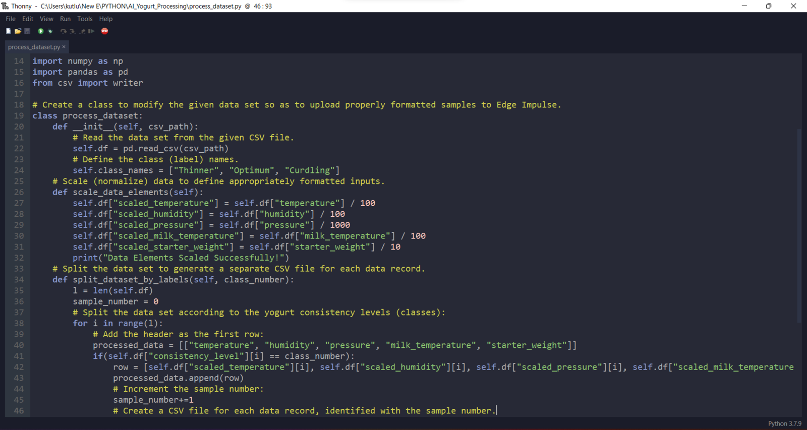 When I completed logging the collected data and assigning labels, I started to work on my artificial neural network model (ANN) to detect yogurt consistency (texture) levels before fermentation so as to improve product quality and reduce the total cost for small dairies. Since Edge Impulse supports almost every microcontroller and development board due to its model deployment options, I decided to utilize Edge Impulse to build my artificial neural network model. Also, Edge Impulse makes scaling embedded ML applications easier and faster for edge devices such as XIAO ESP32C3. Even though Edge Impulse supports CSV files to upload samples, the data type should be time series to upload all data records in a single file. Therefore, I needed to follow the steps below to format my data set so as to train my model accurately:- Data Scaling (Normalizing)