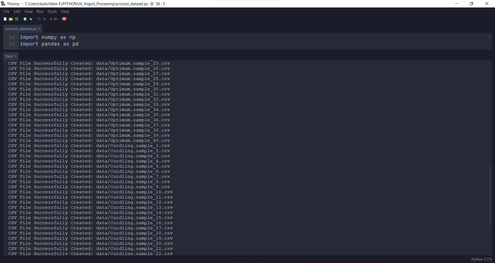If the data type is not time series, Edge Impulse cannot distinguish data records as individual samples from one CSV file while adding existing data to an Edge Impulse project. Therefore, the user needs to create a separate CSV file for each sample, including a header defining data fields. To scale (normalize) and preprocess my data set so as to create individual CSV files as samples automatically, I developed a Python application consisting of one file:- process_dataset.csv