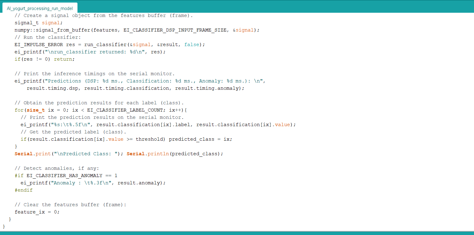 My Edge Impulse neural network model predicts possibilities of labels (yogurt consistency classes) for the given features buffer as an array of 3 numbers. They represent the model’s “confidence” that the given features buffer corresponds to each of the three different yogurt consistency levels (classes) [0 - 2], as shown in Step 5:- 0 — Thinner