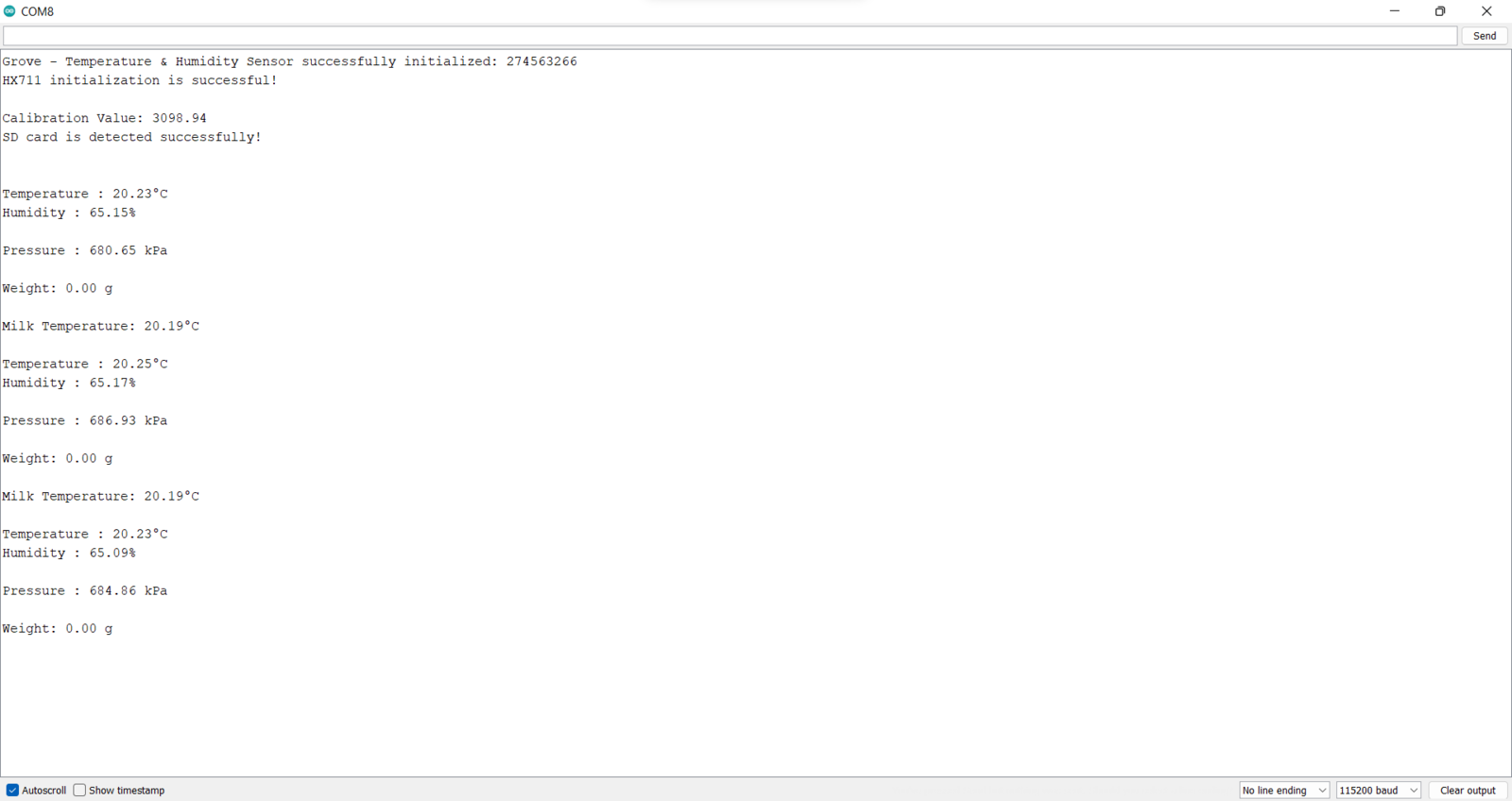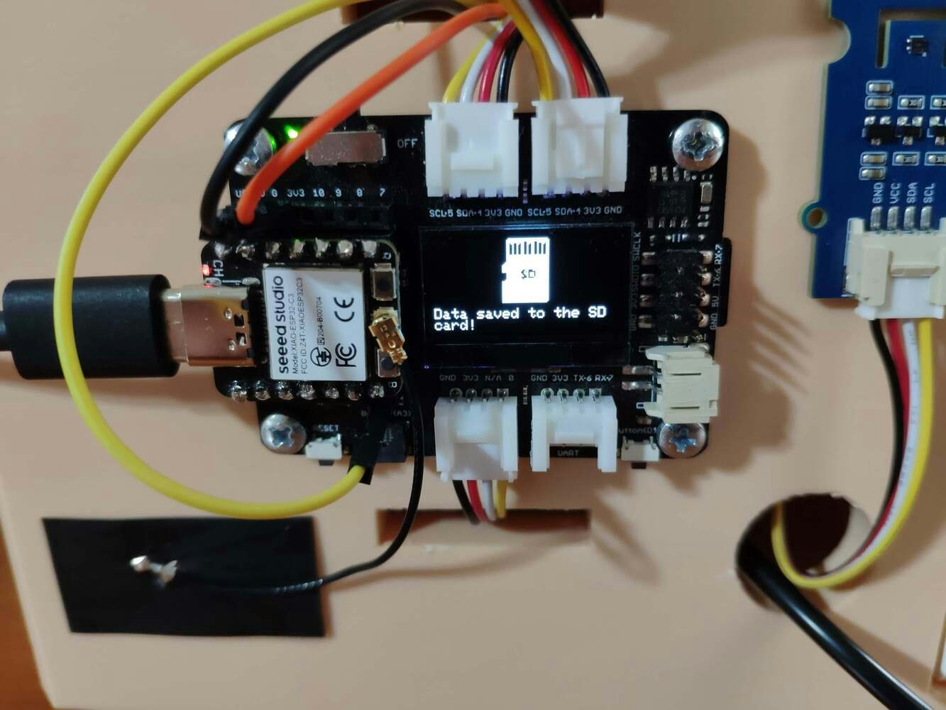 After uploading and running the code for collecting yogurt processing data and for saving information to the given CSV file on the SD card on XIAO ESP32C3: 🐄🥛📲 The device shows the opening screen if the sensor and MicroSD card module connections with XIAO ESP32C3 are successful.