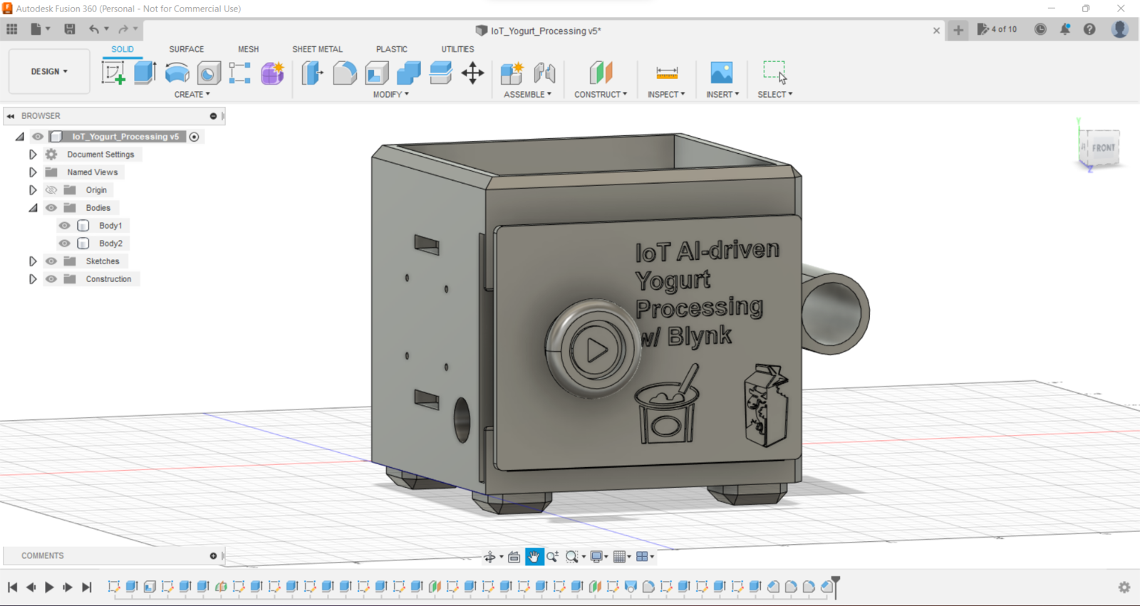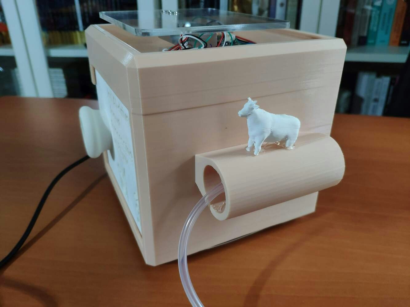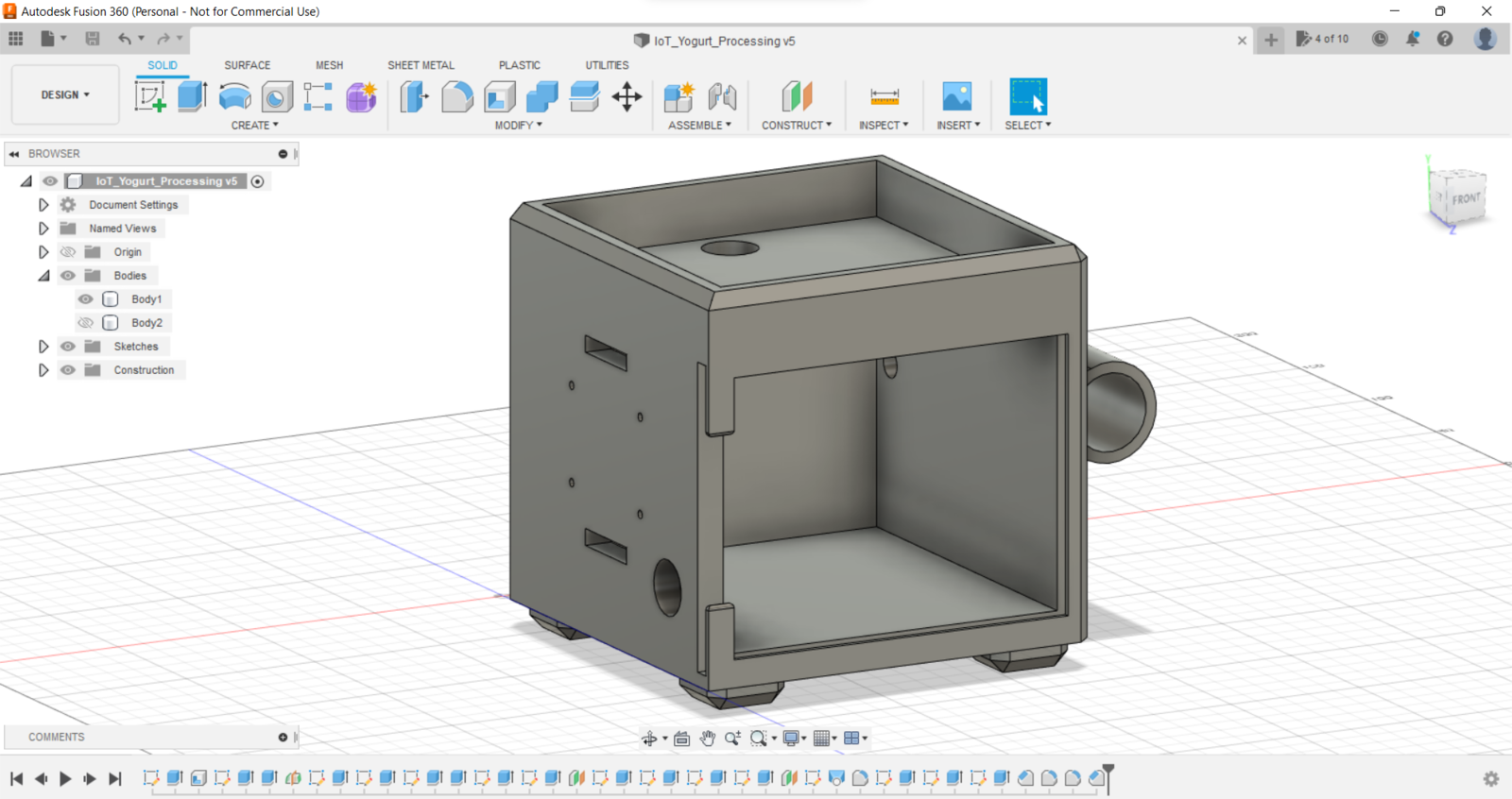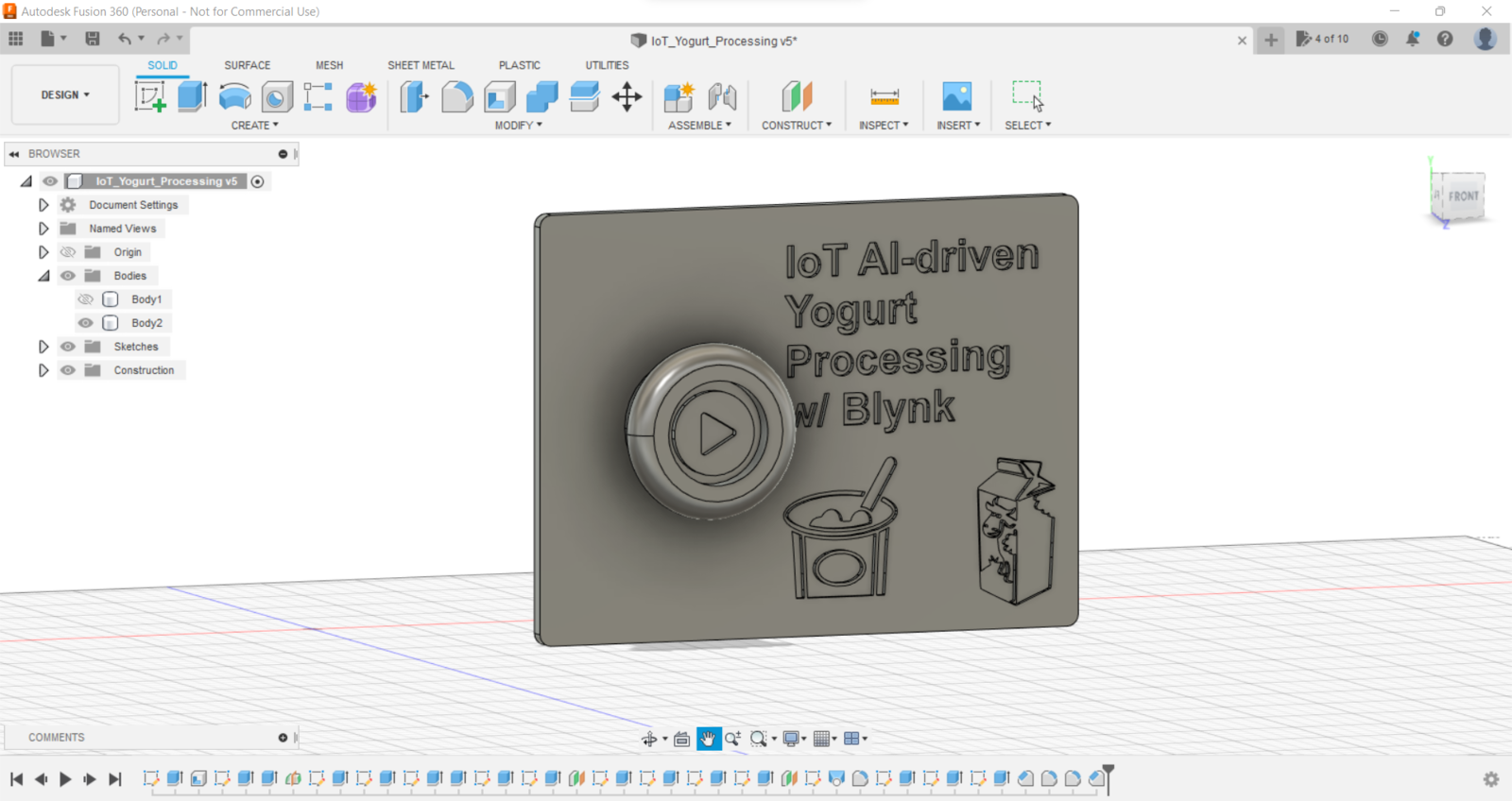 Since I focused on building a budget-friendly and easy-to-use device that collects yogurt processing data and informs the user of the predicted yogurt consistency level before fermentation, I decided to design a robust and sturdy case allowing the user to access the SD card after logging data and weigh yogurt culture (starter) easily. To avoid overexposure to dust and prevent loose wire connections, I added a sliding front cover with a handle to the case. Also, I decided to emboss yogurt and milk icons on the sliding front cover so as to complement the dairy theme gloriously. Since I needed to adjust the rubber tube length of the integrated pressure sensor, I added a hollow cylinder part to the main case to place the rubber tube. Then, I decided to fasten a small cow figure to the cylinder part because I thought it would make the case design align with the dairy theme. I designed the main case and its sliding front cover in Autodesk Fusion 360. You can download their STL files below.