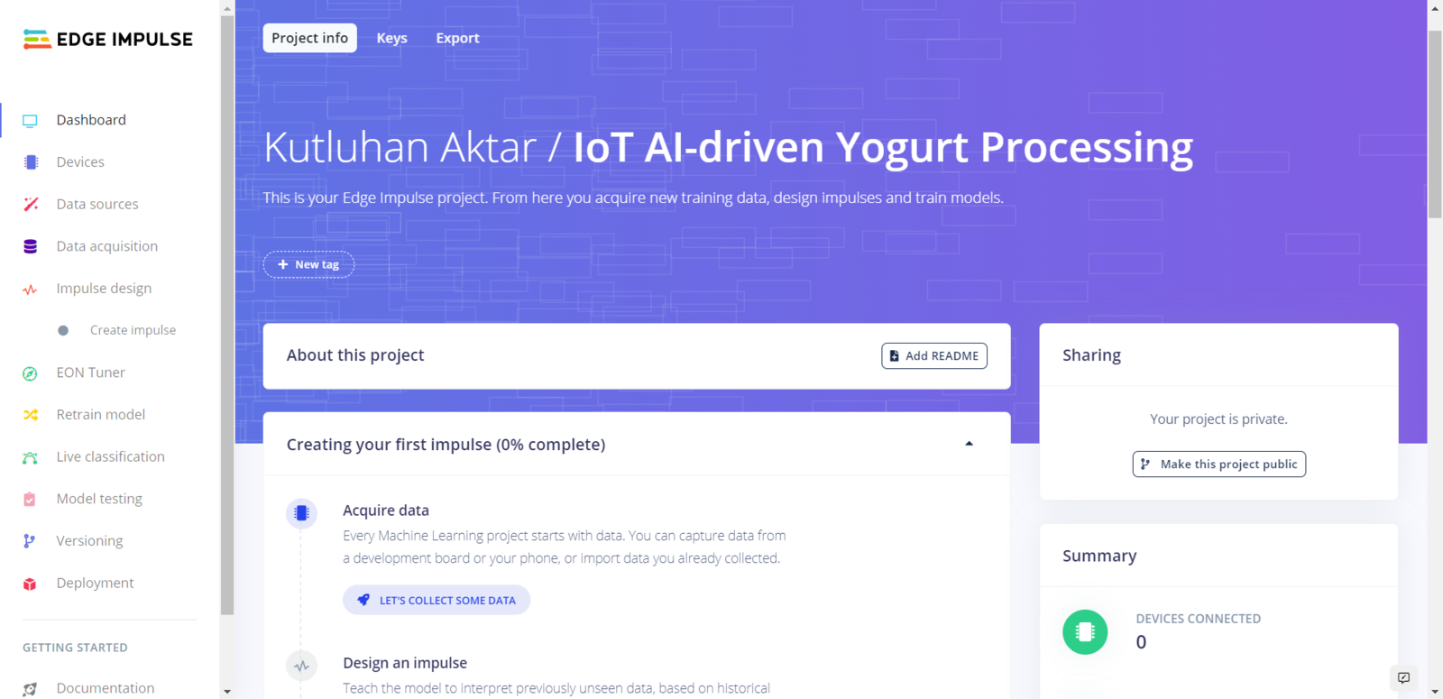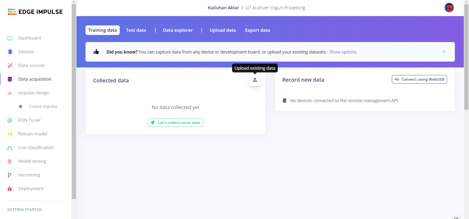 After generating training and testing samples successfully, I uploaded them to my project on Edge Impulse. :hash: First of all, sign up for Edge Impulse and create a new project.
