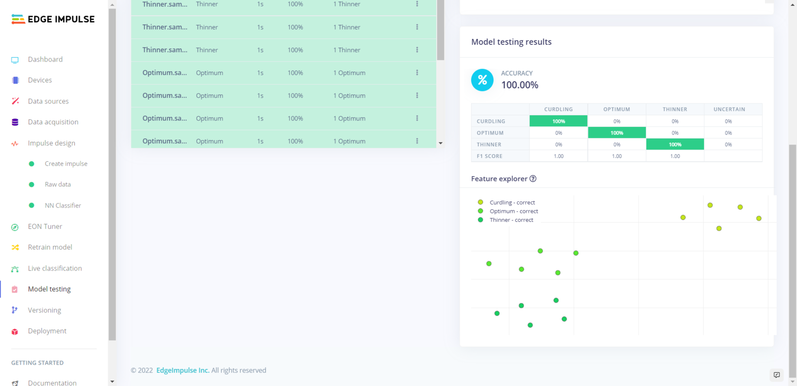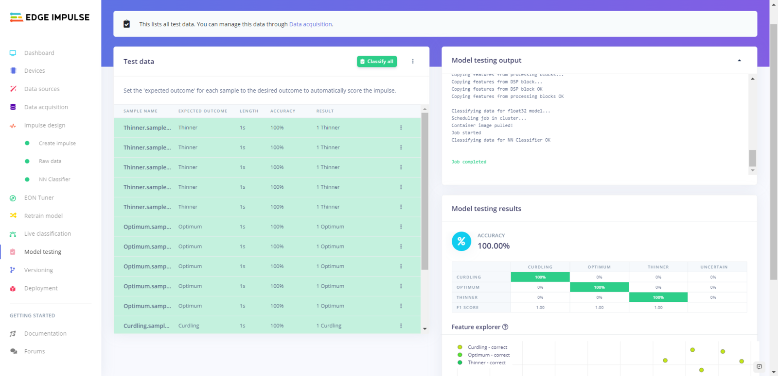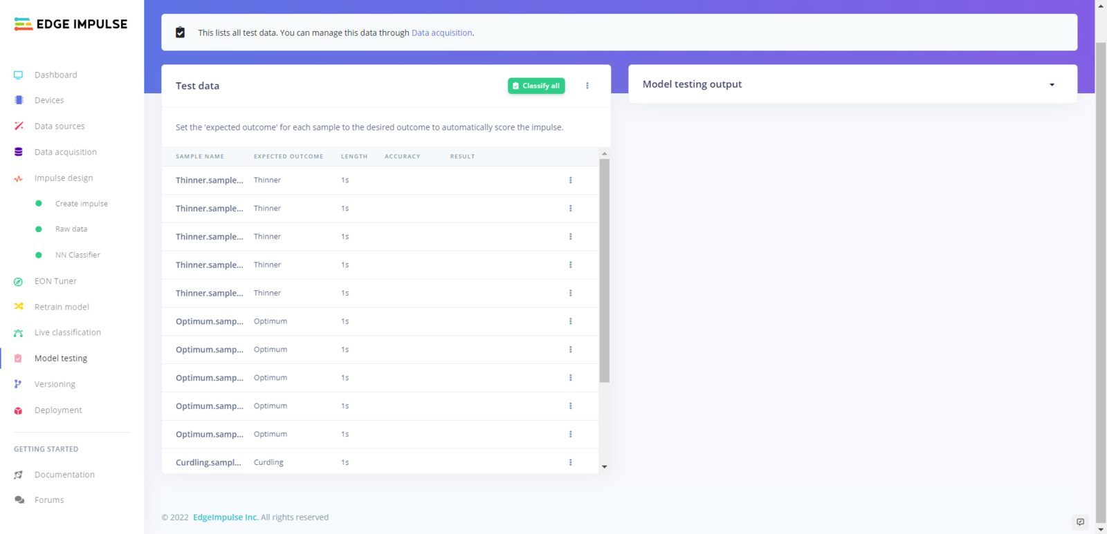 After building and training my neural network model, I tested its accuracy and validity by utilizing testing samples. The evaluated accuracy of the model is 100%. :hash: To validate the trained model, go to the Model testing page and click Classify all.