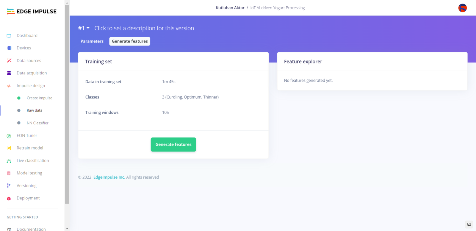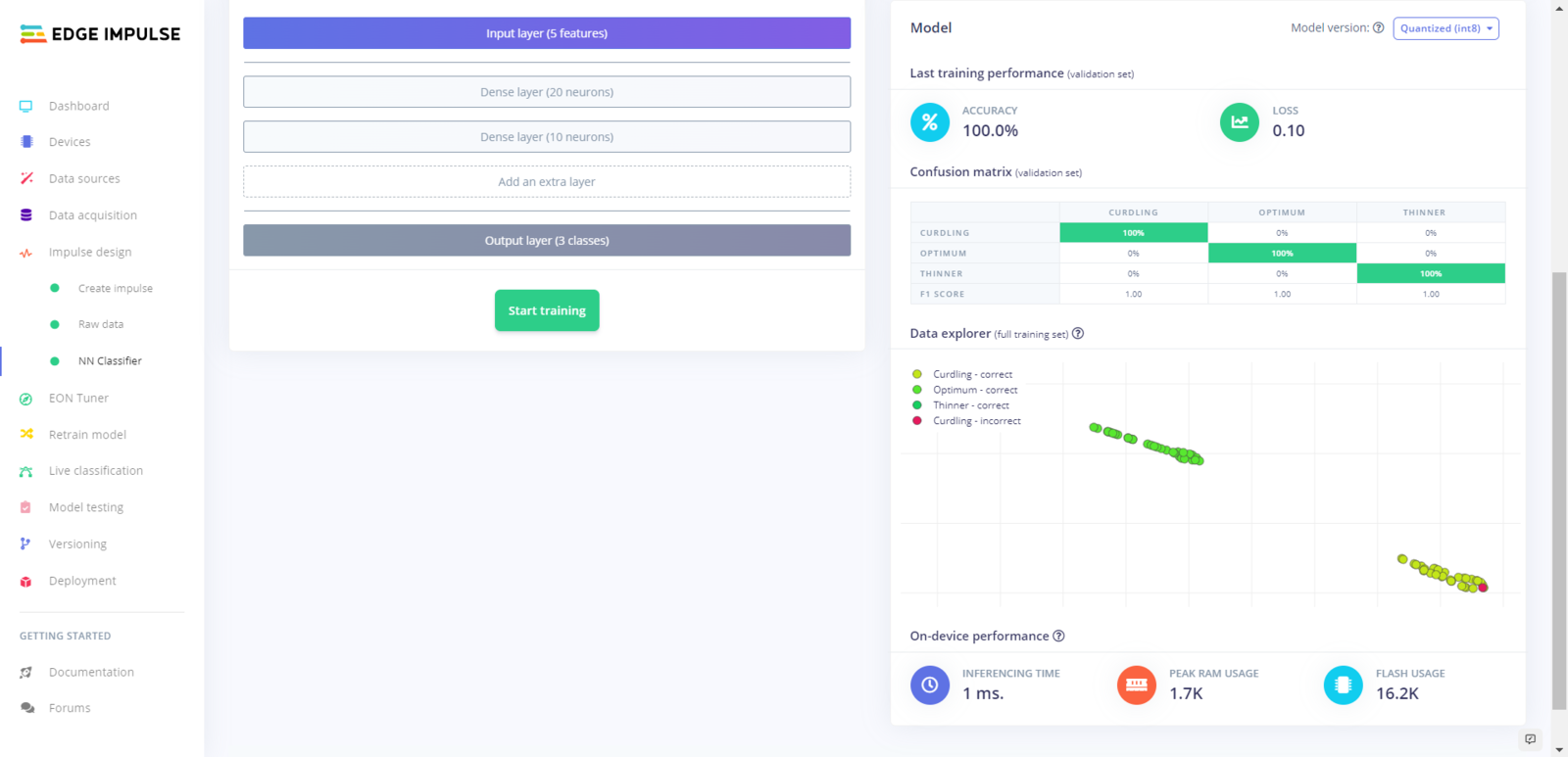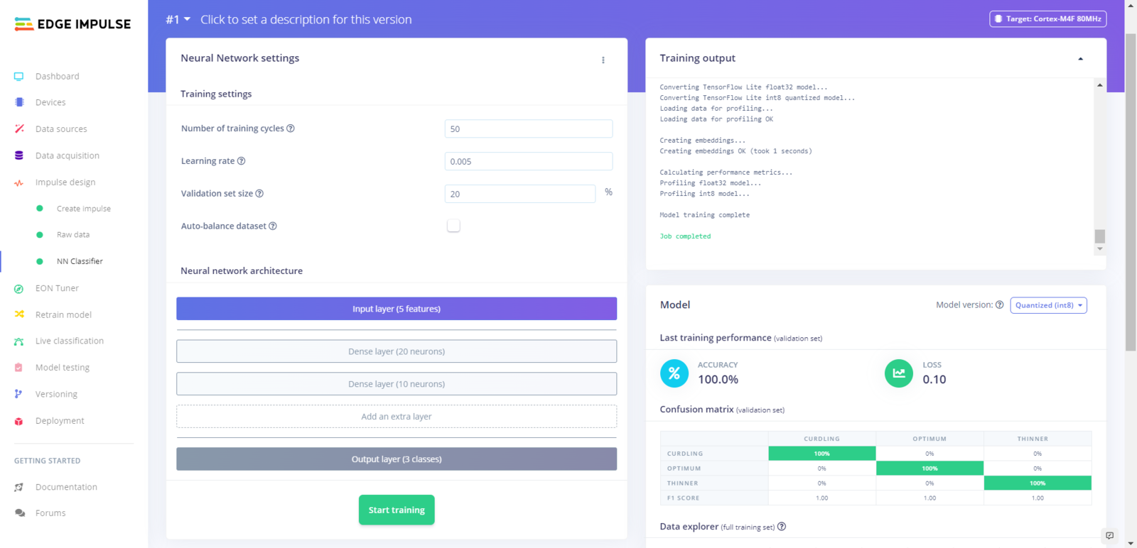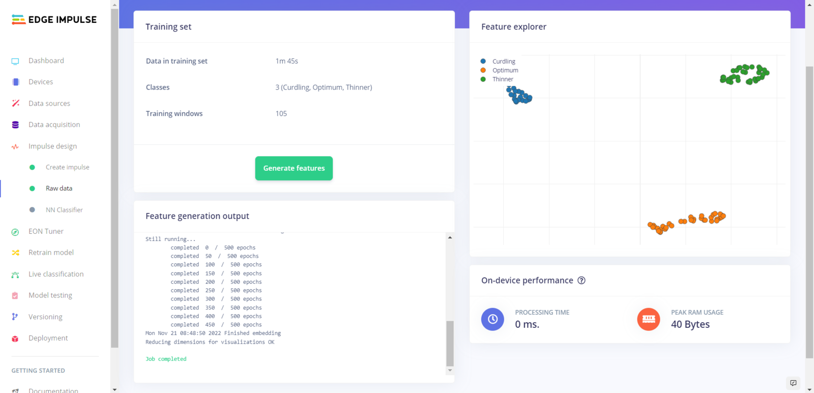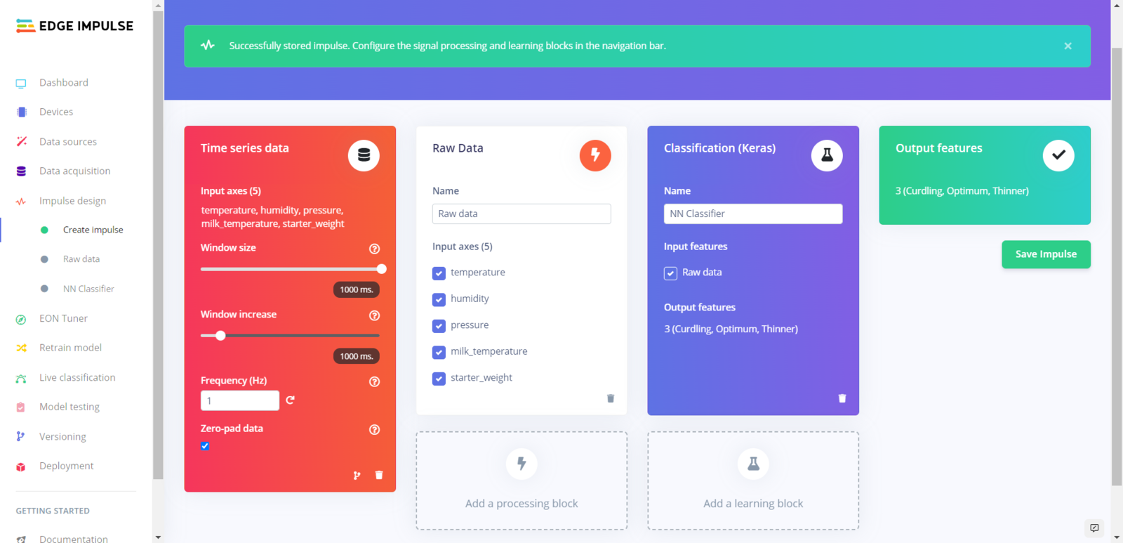 After uploading my training and testing samples successfully, I designed an impulse and trained it on yogurt consistency levels (classes). An impulse is a custom neural network model in Edge Impulse. I created my impulse by employing the Raw Data processing block and the Classification learning block. The Raw Data processing block generate windows from data samples without any specific signal processing. The Classification learning block represents a Keras neural network model. Also, it lets the user change the model settings, architecture, and layers. :hash: Go to the Create impulse page. Then, select the Raw Data processing block and the Classification learning block. Finally, click Save Impulse.