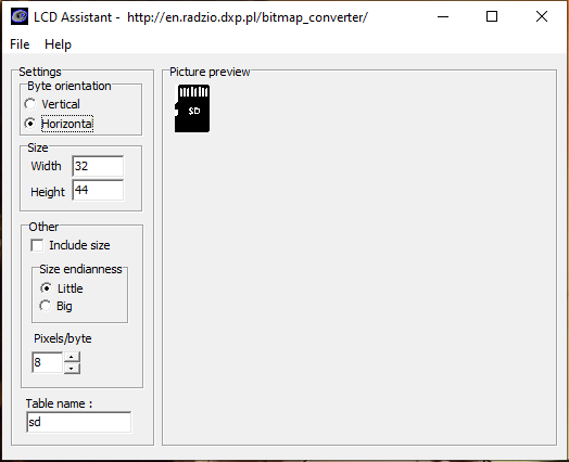 To display images (black and white) on the SSD1306 OLED screen successfully, I needed to create monochromatic bitmaps from PNG or JPG files and convert those bitmaps to data arrays. :hash: First of all, download the LCD Assistant. :hash: Then, upload a monochromatic bitmap and select Vertical or Horizontal depending on the screen type. :hash: Convert the image (bitmap) and save the output (data array). :hash: Finally, add the data array to the code and print it on the screen.