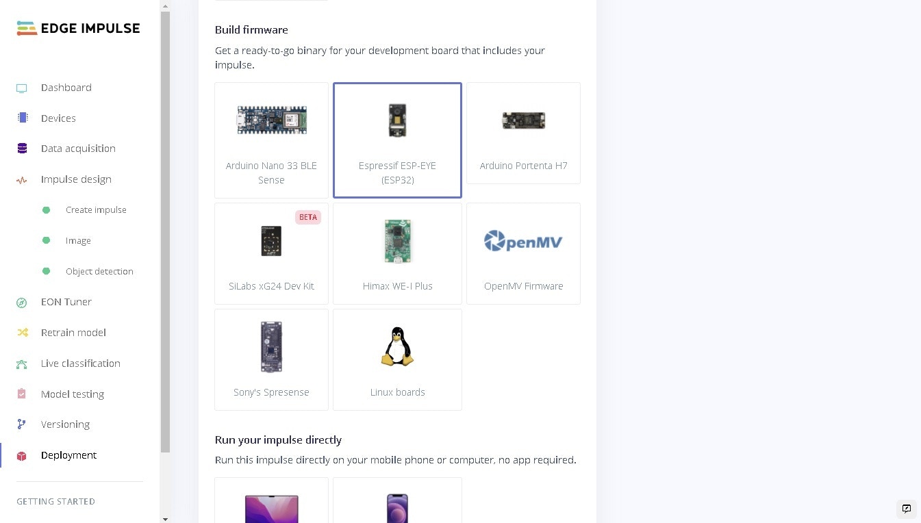 To deploy our model, first go to the “Deployment” section. Next, under “Build firmware” we select Espressif ESP-EYE (ESP32) from the options. To increase performance on the board, we set “Enable EON Compiler” and chose “Quantized(int8)” optimization. This makes our model use 243.9K of RAM and 77.5K of Flash on the board. Chose “Build” and the firmware will be downloaded after the build ends.