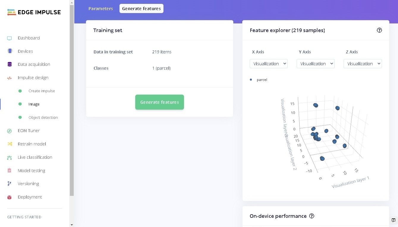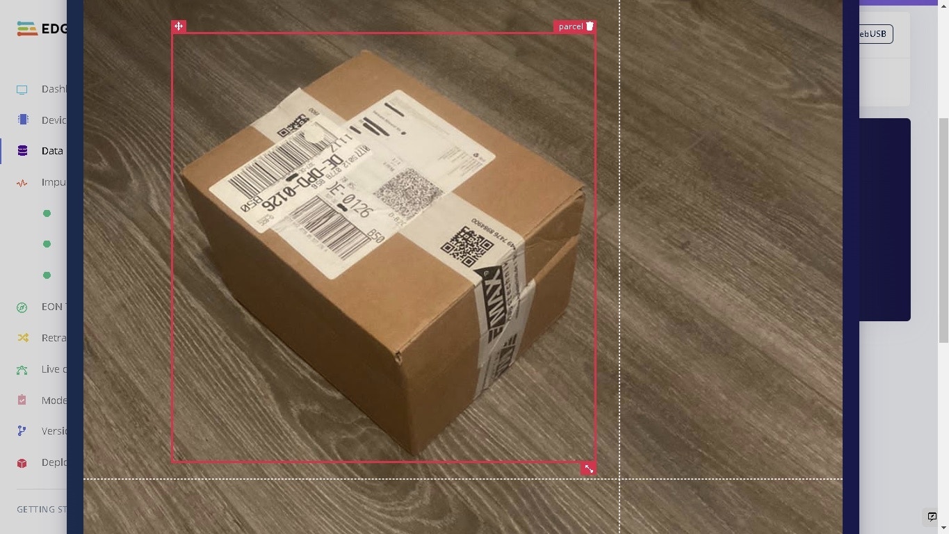 First, on the Project Dashboard, we set Labeling method to “Bounding boxes (object detection)”. We want our Machine Learning model to detect parcels in an image. To do this, we need pictures of parcels! Note that our dataset only includes box parcels and not envelopes or poly-mailer bags. In total, the dataset has 275 images with an 80/20 split for train and test data. If you want to add more images to the dataset, Edge Impulse has an uploader that enables different ways of adding data to your project. Afterwards, make sure to perform a Train/test split to re-balance your dataset. Next, we annotate the images and label a parcel in each image.