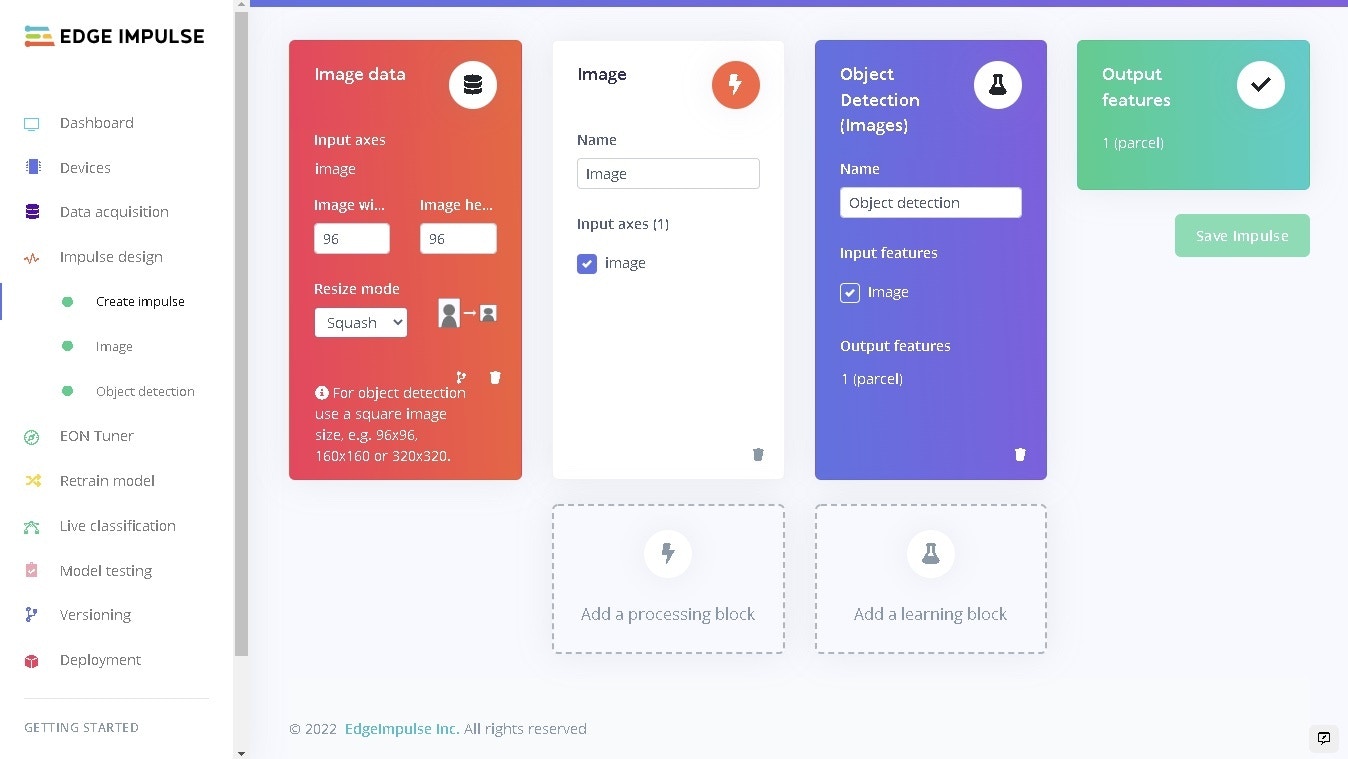 We can now use our dataset to train our model. This requires two important features: a processing block and learning block. Documentation on Impulse Design can be found here. We first click ”Create Impulse”. Here, set image width and height to 96x96; and Resize mode to Squash. The Processing block is set to “Image” and the Learning block is “Object Detection (images)”. Click ‘Save Impulse’ to use this configuration. Since the ESP-EYE is resource-constrained device (4MB flash and 8MB PSRAM), we have used 96x96 image size to lower RAM usage.