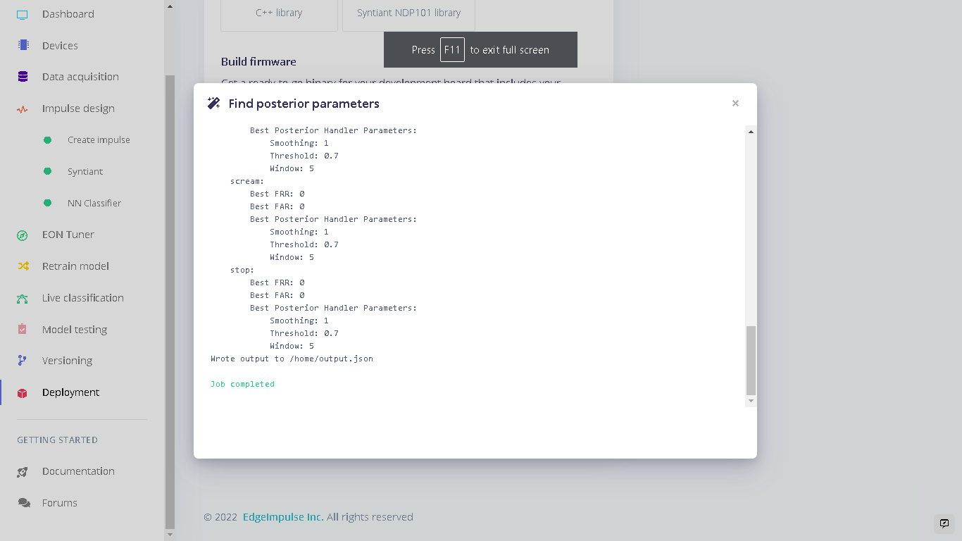 To deploy our model to the Syntiant Board, first click “Deployment”. Here, we will first deploy our model as a firmware on the board. When our audible events (cry, scream, help, stop) are detected, the onboard RGB LED will turn on. When the unknown sounds are detected, the on board RGB LED will be off. This runs locally on the board without requiring an internet connection, and runs with minimal power consumption. Under “Build Firmware” select Syntiant TinyML.