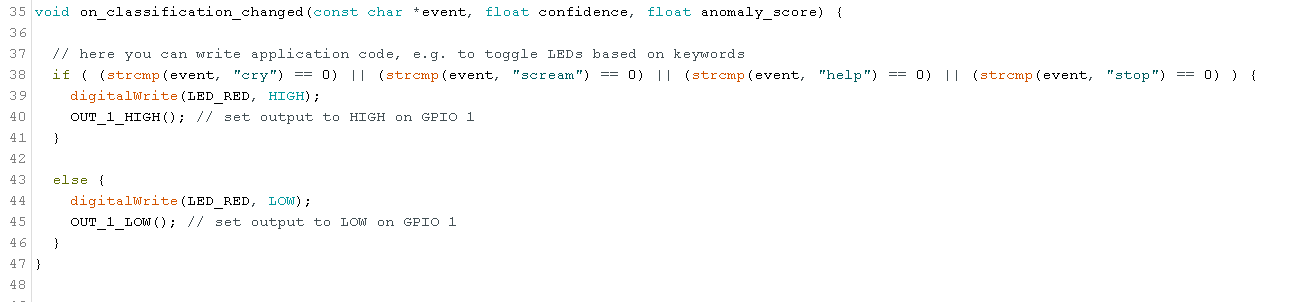 We can use our Machine Learning model as a safety feature for actuators, machines or other operations involving people and machines. To do this we can build custom firmware for our Syntiant TinyML board that turns a GPIO pin HIGH or LOW based on the detected event. The GPIO pin can then be connected to a controller that runs an actuator or a system. The controller can then turn off the actuator or process when a signal is sent by the Syntiant TinyML board.