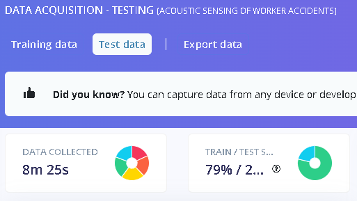 You can find the public project here: Acoustic Sensing of Worker Accidents. To add this project into your account projects, click “Clone this project” at the top of the window. Next, go to the “Deploying to Syntiant TinyML Board” section below to see how you can deploy the model to the Syntiant TinyML board. Alternatively, to create a similar project, follow the next steps after creating a new Edge Impulse project.Data Acquisition