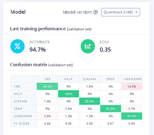 When training our model, we used 80% of the data in our dataset. The remaining 20% is used to test the accuracy of the model in classifying unseen data. We need to verify that our model has not overfit by testing it on new data. If your model performs poorly, then it means that it overfit (crammed your dataset). This can be resolved by adding more data and/or reconfiguring the processing and learning blocks if needed. Increasing performance tricks can be found in this guide. On the left bar, click “Model testing” then “classify all”. Our current model has a performance of 91% which is pretty good and acceptable. From the results we can see new data called “testing” which was obtained from the environment and sent to Edge Impulse. The Expected Outcome column shows which class the collected data belong to. In all cases, our model classifies the sounds correctly as seen in the Result column; it matches the Expected outcome column.