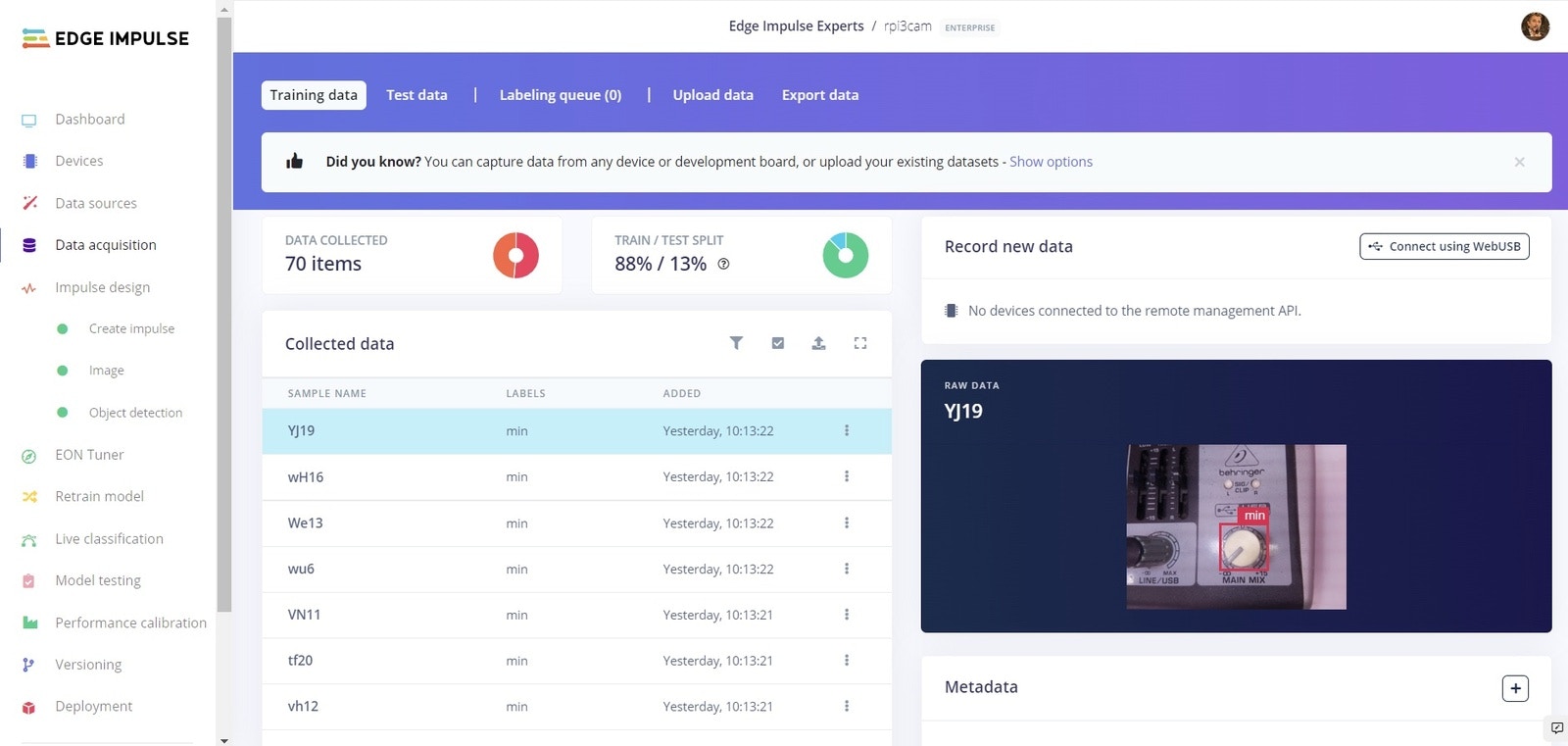 A Raspberry Pi running Linux will receive console audio out through a USB port, and record a.wav file. At the same time, a connected camera will take pictures and run inference against an Edge Impulse machine learning model. If knobs are detected in the wrong position, the recording will be automatically aborted.