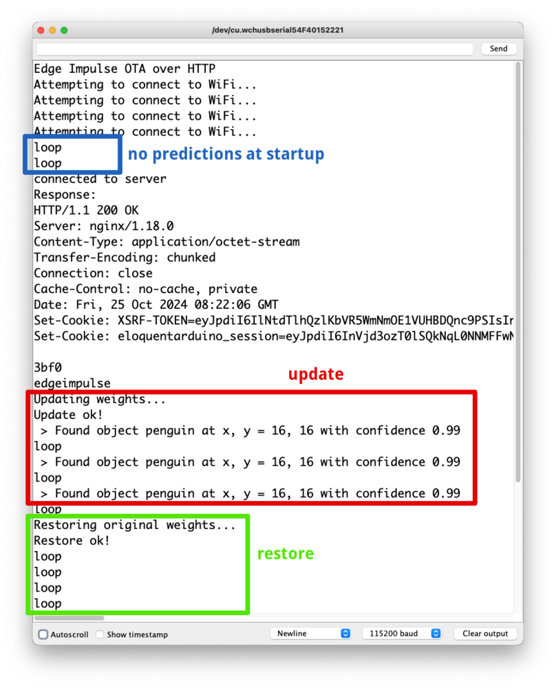 Now you have all the pieces required to perform model weights updates over-the-air for your project:- a method to patch a genuine Edge Impulse library that allows for weights’ replacement