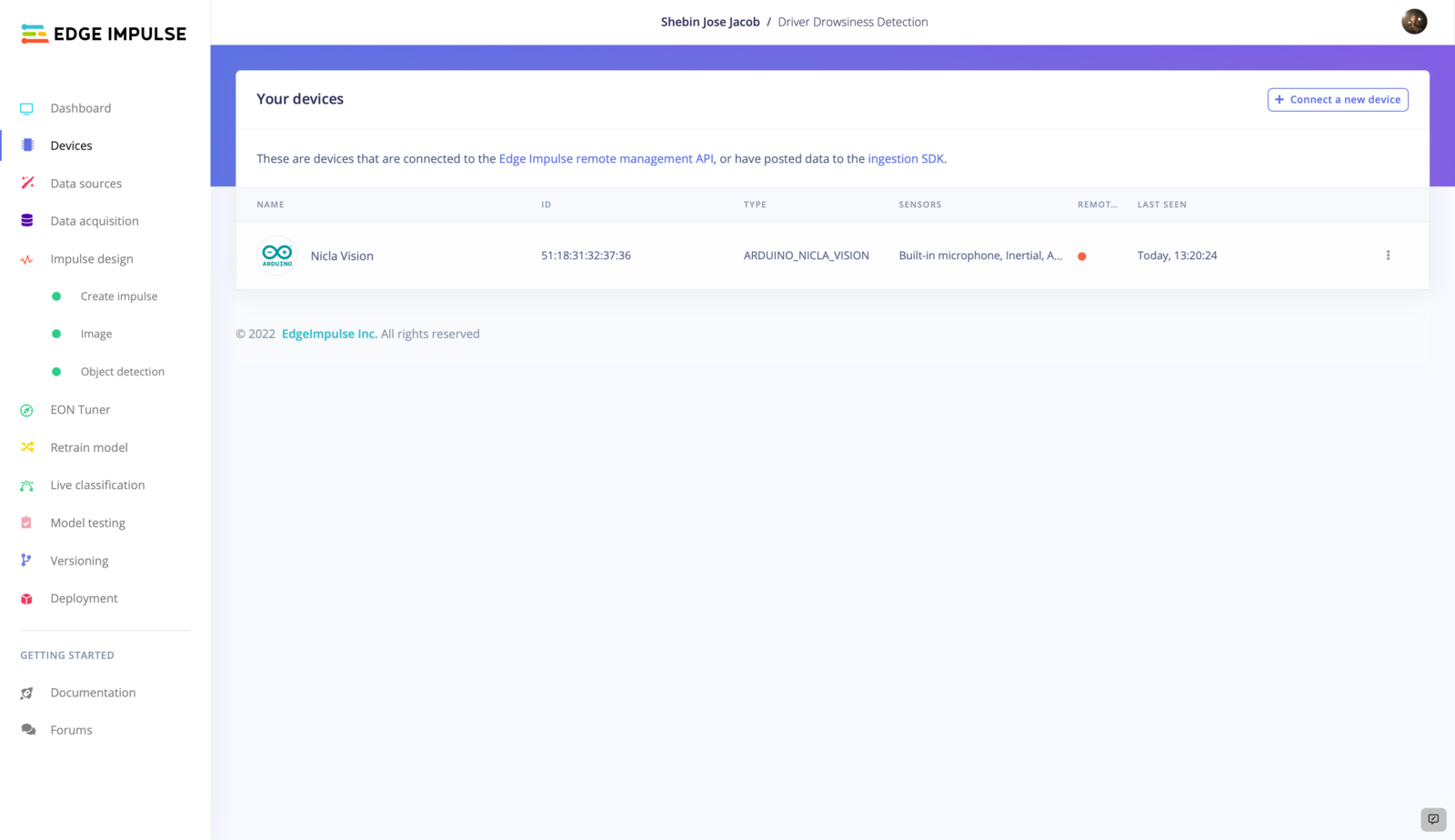 If you are unfamiliar with the process of setting up the Nicla Vision for use with Edge Impulse and haven’t yet connected the device to the Edge Impulse dashboard, we recommend following a quick tutorial to guide you through the setup process. Upon successfully establishing a connection between the device and the Edge Impulse dashboard, you should expect to see the device appear in the Devices tab.