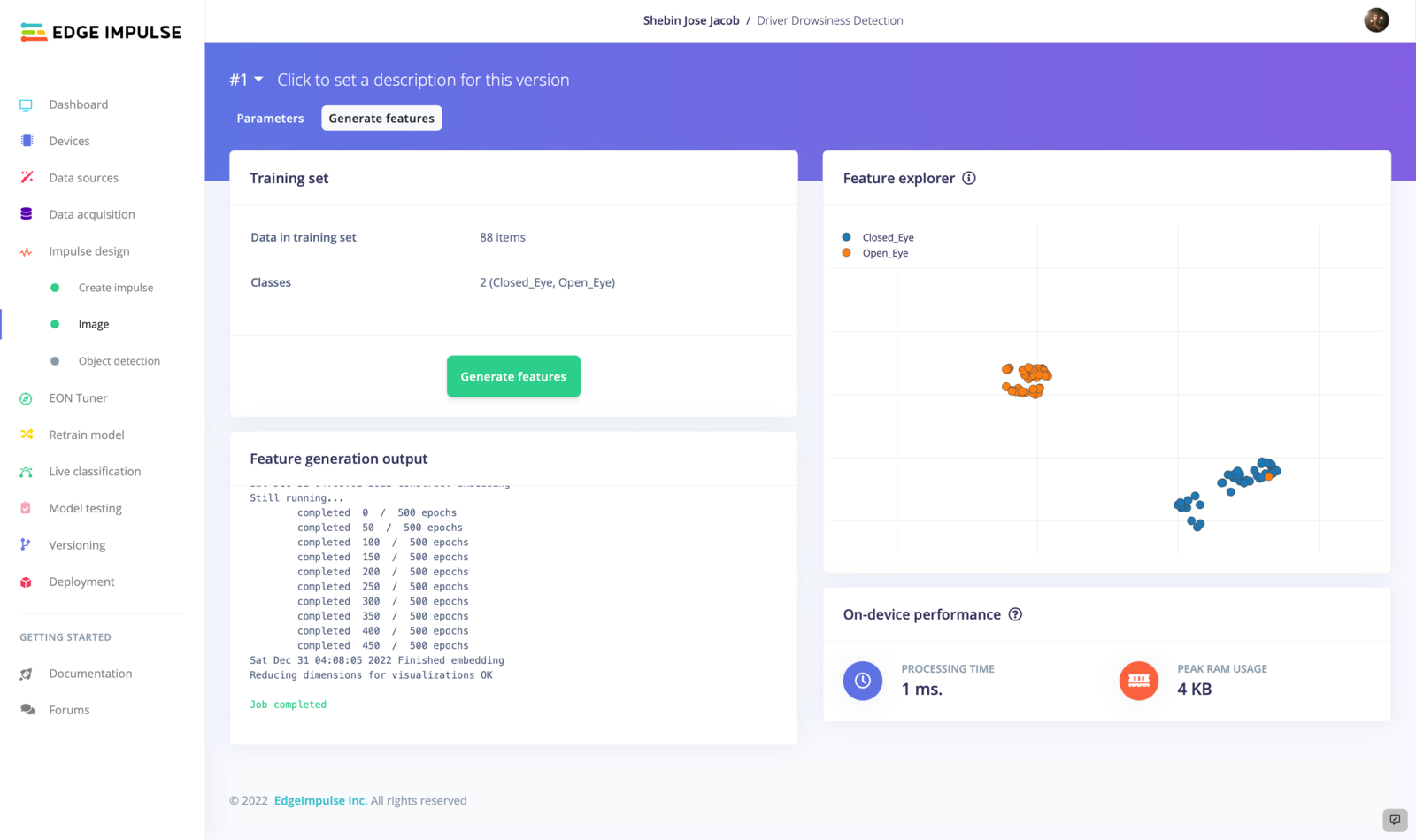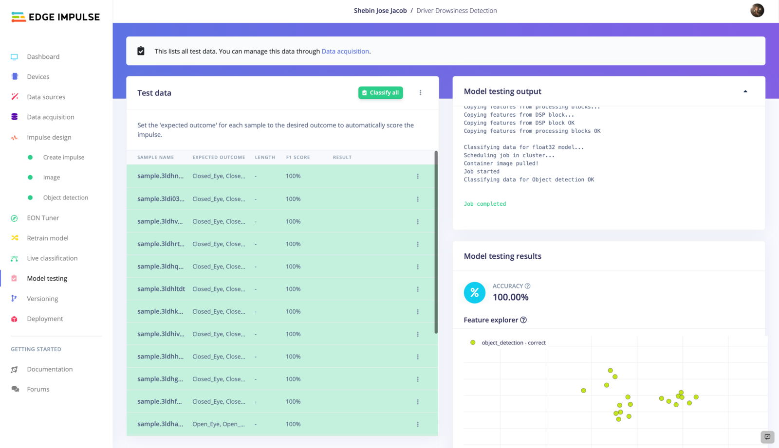 It is now time to move on to the final phase of testing or rather a mock deployment of our machine-learning model. During this phase, we will simulate the use of the model in a real-world setting and evaluate its performance under these conditions. This will allow us to see how well the model performs in a more realistic environment and ensure that it is ready for deployment. It is now time to proceed to the Live Classification tab and acquire a sample from the device. Once we have acquired the sample, we will classify it and observe the results. If our model is able to accurately distinguish between closed and open eyes, we can confidently move forward with deployment.