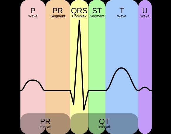 The ECG is separated into two basic intervals: the PR Interval and the QT Interval. The PR interval is the initial wave generated by an electrical impulse traveling from the right atrium to the left. Then inside the QT there is a complex process that generates the signature “beep” in cardiac monitors. During QRS both ventricles begin to pump. After the initial contraction comes the ST segment (the time where the ventricles waiting to be “re-polarized”). Finally the T wave becomes present to actively “re-polarize”, or relax the ventricles.