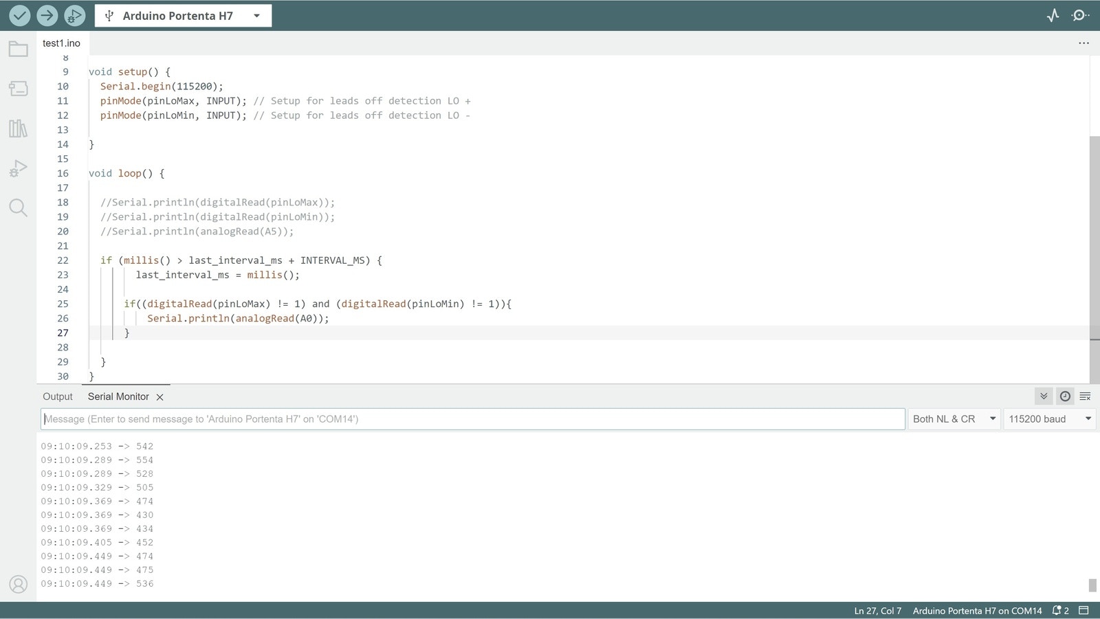 Note: Remember to disconnect the AC from the laptop before sampling.Upload the Data Forwarding acquisition script to the Arduino Portenta using the Arduino IDE. Check that the values being obtained are stable in the Serial Monitor (Center value of about ~500 with spikes between +300/-200)