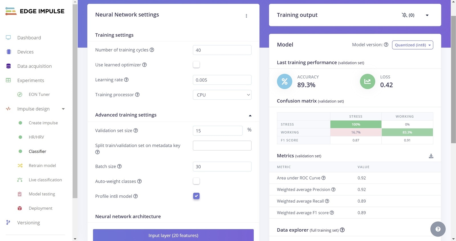 Edge Impulse recently added a learning block specifically designed for this scenario. The HR/HRV Features block processes physiological signals like the electrocardiogram (ECG), with optional accelerometer inputs for enhanced accuracy in motion-prone applications, to extract key metrics such as heart rate (HR) and heart rate variability (HRV). HR measures the number of beats per minute, while HRV measures the time variance between successive heartbeats, also known as the interbeat interval (IBI). The block offers real-time HR estimation and HRV analysis on resource-constrained edge devices and leverages cutting-edge algorithms for precise feature extraction. The extracted features can be used on their own or to inform downstream machine learning tasks such as stress detection or heart health analysis.