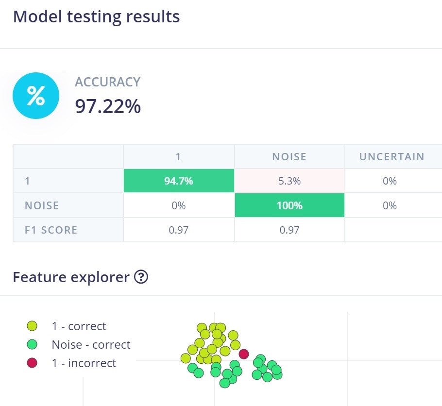 - After just a short while, depending on the amount of test samples and model complexity, you will get a performance report. Unless you have lots of data or a perfect model, the performance is seldom 100 %. Depending on your use case and what performance you require, you might need to go back a few steps by collecting more and different data, or by tweaking the parameters, to reach your minimum expectations.