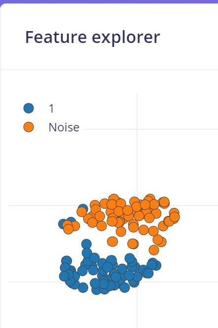 - After a while you will see a graph in the Feature explorer. This gives you a view of how well your data can be clustered into different groups. In an ideal situation all similar samples would be clustered into same group with a clear distinction between groups. If that’s not the case, no worries at this point, the neural network algorithm will in many cases still be able to do a very good job!