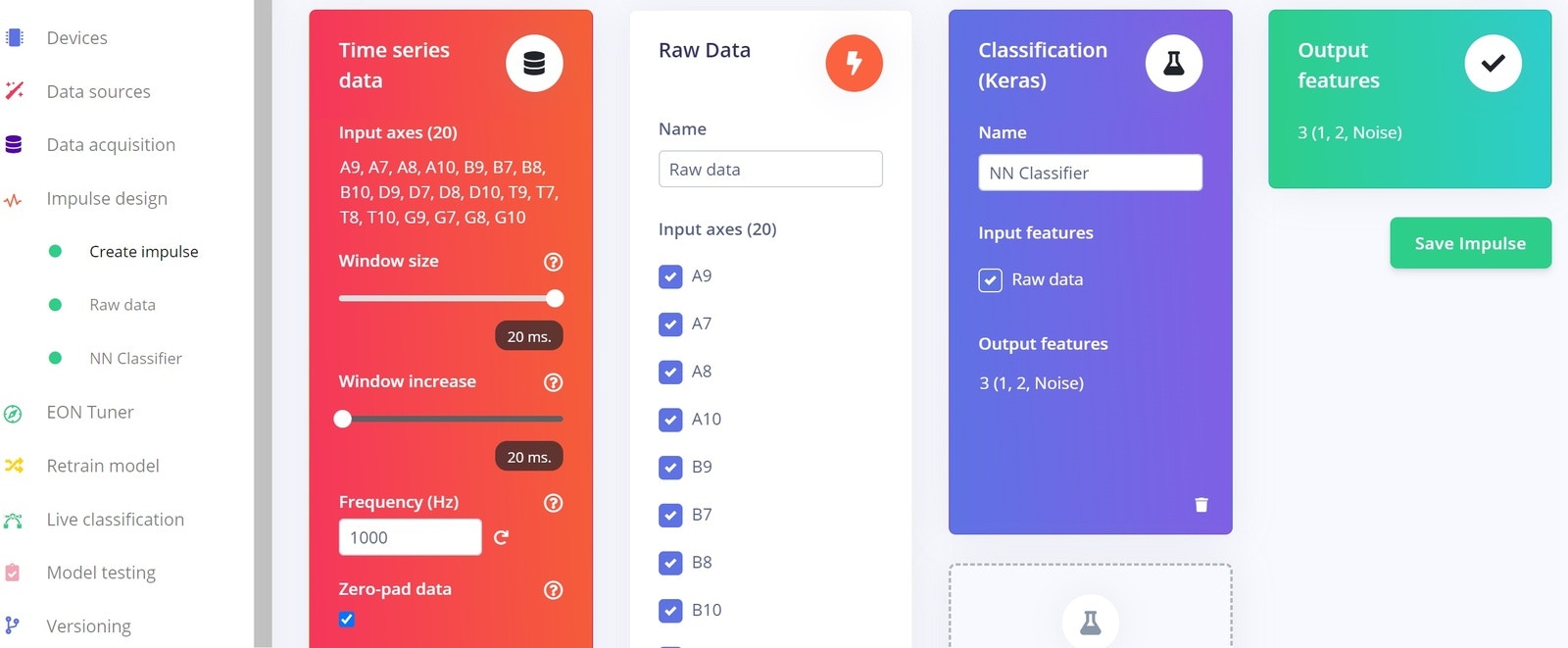 Save impulseandRaw dataon the left hand menu- You will see a graph of one of the samples as well as the raw features.