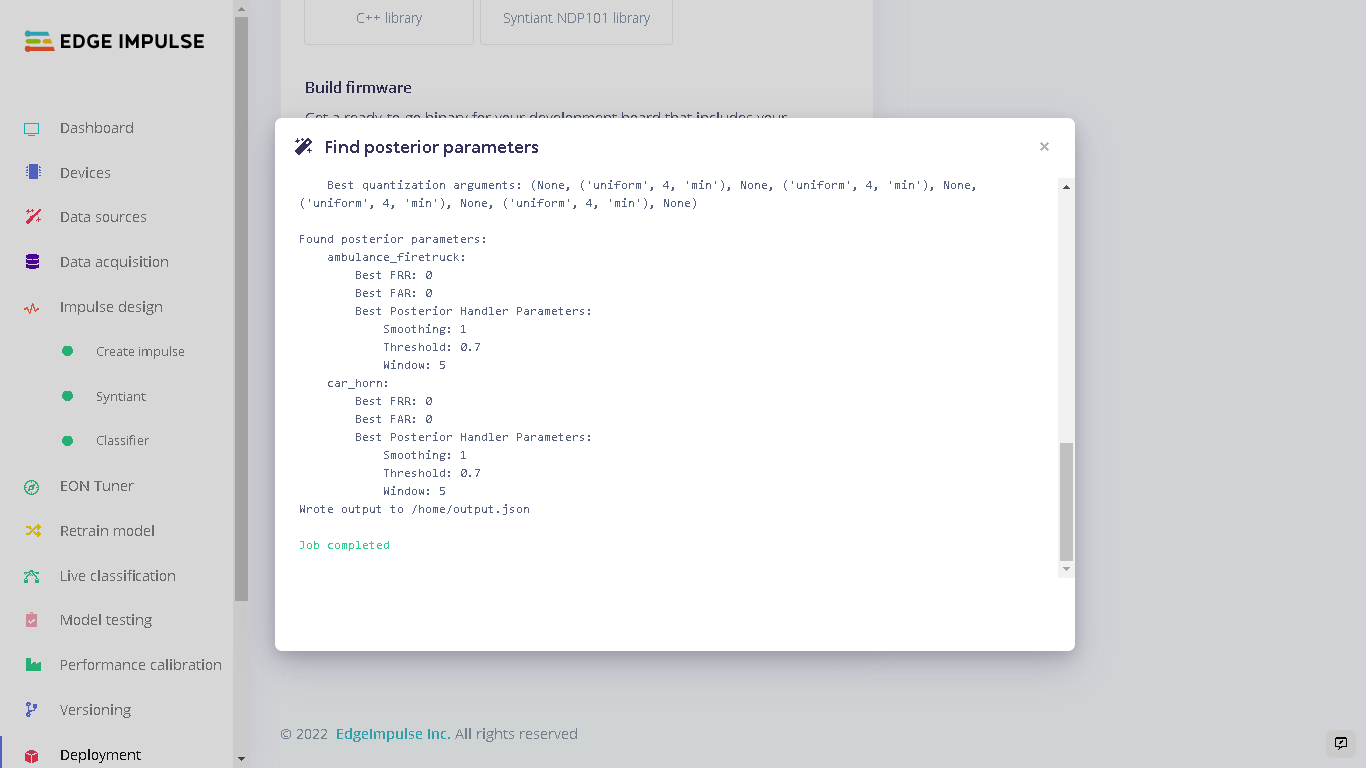 To deploy our model to the Syntiant Board, first click “Deployment” on the left side panel. Here, we will first deploy our model as a firmware for the board. When our audible events: ambulance_firetruck and car_horn are detected, the onboard RGB LED will turn on. When the “unknown” sounds are detected, the onboard RGB LED will be off. This firmware runs locally on the board without requiring internet connectivity and also with minimal power consumption. Under “Build Firmware” select Syntiant TinyML.