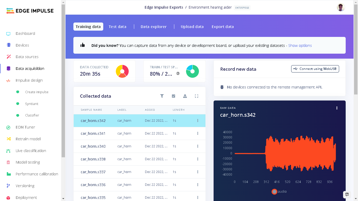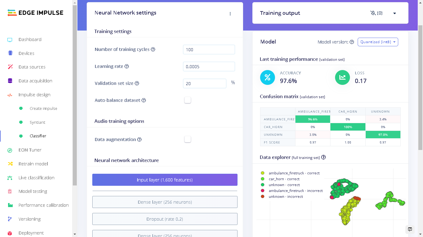 I first searched for open datasets of ambulance siren, firetruck siren, car horns and traffic sounds. I used the Kaggle dataset of Emergency Vehicle Siren Sounds and the Isolated urban sound database for the key sounds. From these datasets, I created the classes “ambulance_firetruck” and “car_horn”. In addition to the key events that I wanted to be detected, I also needed another class that is not part of them. I labelled this class as “unknown” and it has sounds of traffic, people speaking, machines, and vehicles, among others. Each class has 1 second of audio sounds. In total, I had 20 minutes of data for training and 5 minutes of data for testing. For part of the “unknown” class, I used Edge Impulse keywords dataset. From this dataset, I used the “noise” audio files.