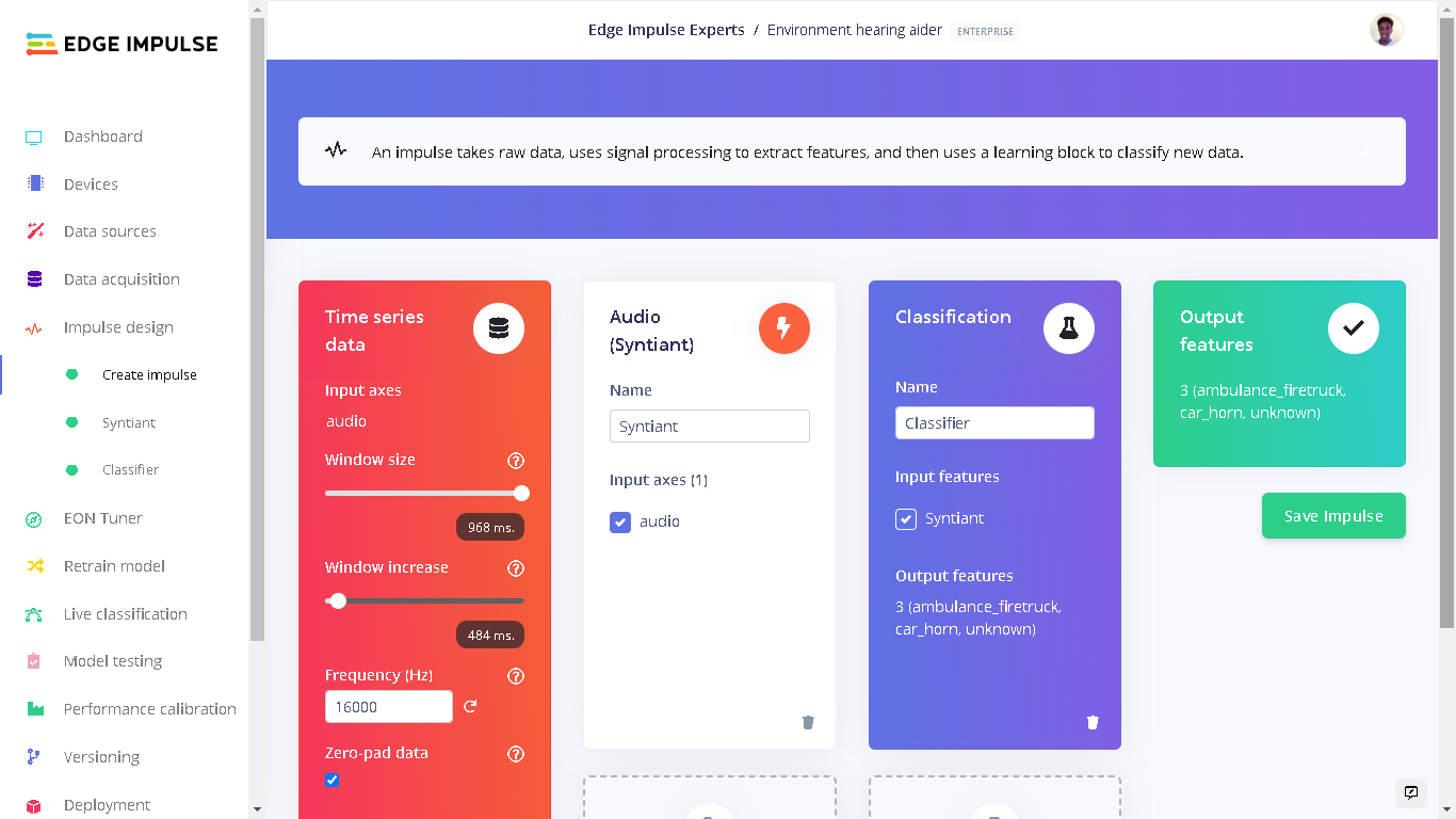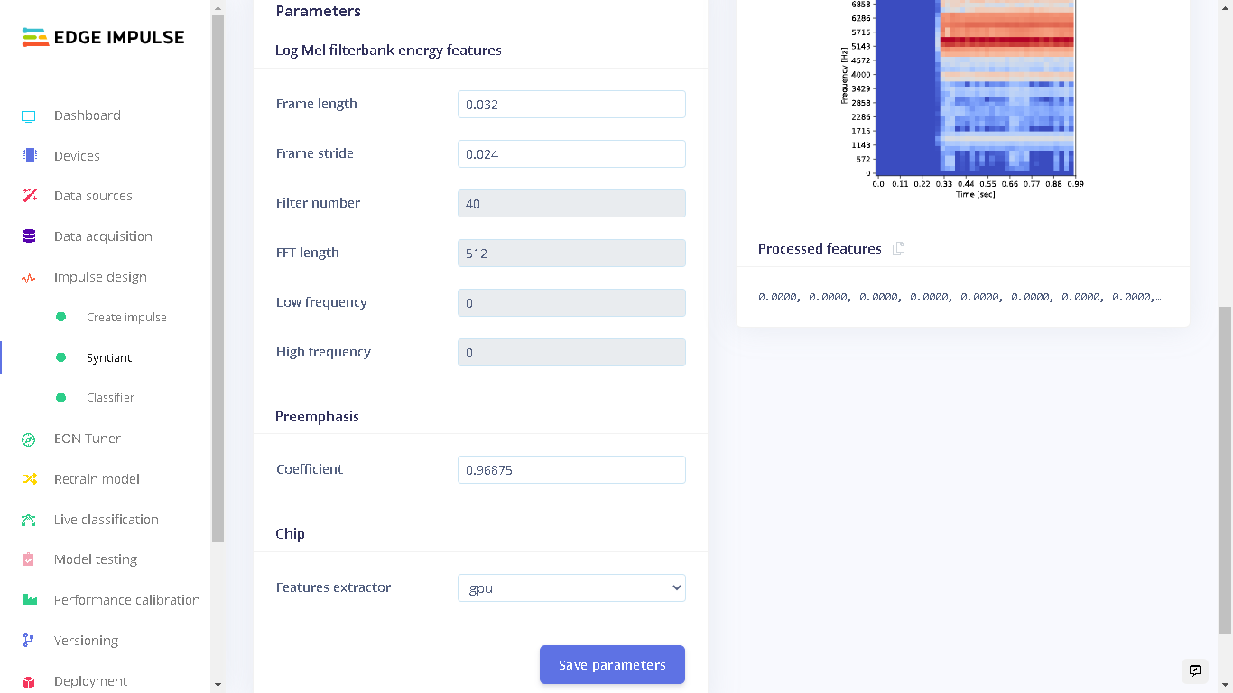 The Impulse design was very unique as I was targeting the Syntiant TinyML board. Under “Create Impulse” I set the following configurations: The window size is 968ms and window increase is 484ms milliseconds(ms). I then added the “Audio (Syntiant)” processing block and the “Classification” Learning block. For a detailed explanation of the Impulse Design for the Syntiant TinyML audio classification, checkout the Edge Impulse documentation.