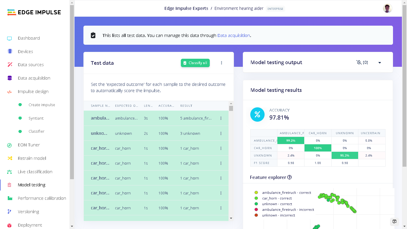 When training the model, I used 80% of the data in the dataset. The remaining 20% is used to test the accuracy of the model in classifying unseen data. We need to verify that our model has not overfit by testing it on new data. If your model performs poorly, then it means that it overfit (crammed your dataset). This can be resolved by adding more dataset and/or reconfiguring the processing and learning blocks if needed. Increasing performance tricks can be found in this guide. On the left bar, we click “Model testing” then “Classify all”. The current model has a performance of 97.8% which is pretty good and acceptable.