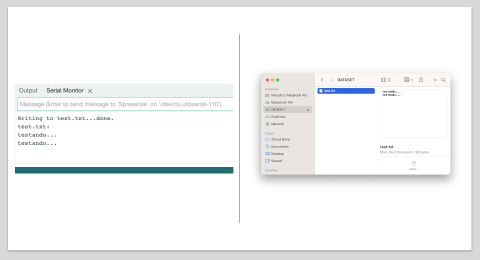 Run: Examples → File → read_write.ino under Espressif. You should see the messages on the Serial Monitor showing that “testing…” was written on the SD card. Remove the SD card and check it on your computer. Note that I gave my card the name DATASET. Usually, for new cards, you will see, for example, NO NAME.