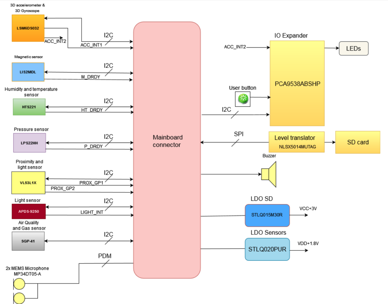 The CommonSense expansion board, produced by SensiEDGE, provides an array of new sensor capabilities to Spresense, including an accelerometer, gyroscope, magnetometer, temperature, humidity, pressure, proximity, ambient light, IR, microphone, and air quality (VOC). As a user interface, the board contains a buzzer, a button, an SD card reader, and a RGB LED. The CommonSense board also features an integrated rechargeable battery connection, eliminating the necessity for a continuous power supply and allowing finished products to be viable for remote installations where a constant power source might be challenging to secure. Below is a block diagram showing the board’s main components: