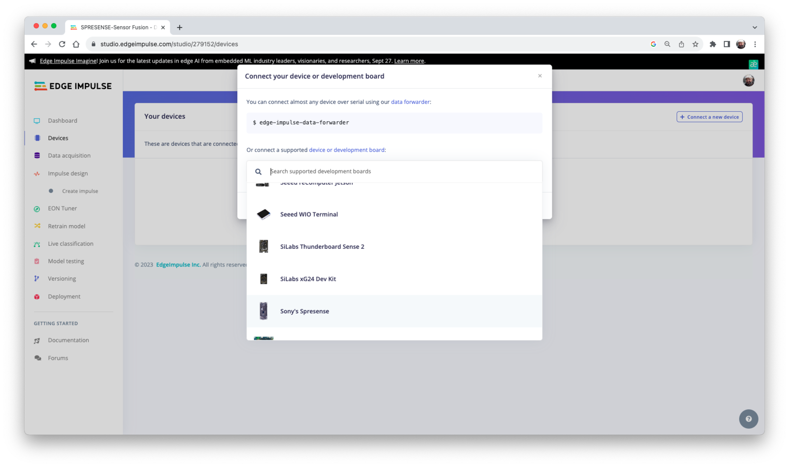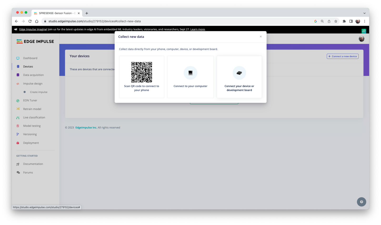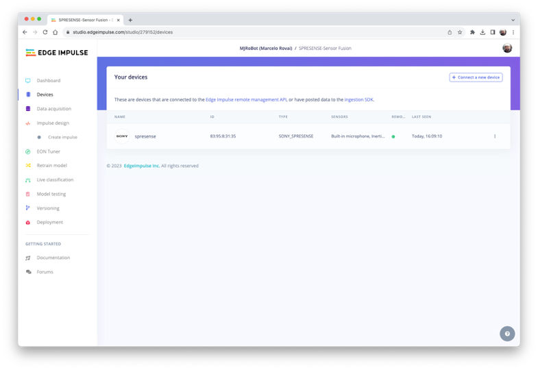 Go to EdgeImpulse.com, create a Project, and connect the device: