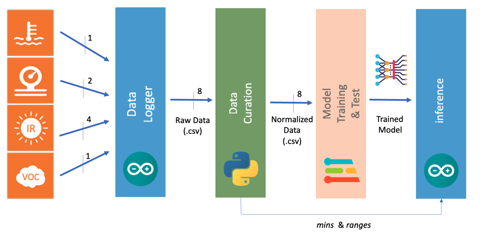 In the tutorial “Using Sensor Fusion and Machine Learning to Create an AI Nose”, Shawn Hymel explains how to have a sound Sensor Fusion project. In this project, we will follow his advice. Use the notebook[data_preparation.ipynb](https://github.com/Mjrovai/Sony-Spresense/blob/main/notebooks/Spresence-CommonSense/data_preparation.ipynb) for data curation, following the steps: