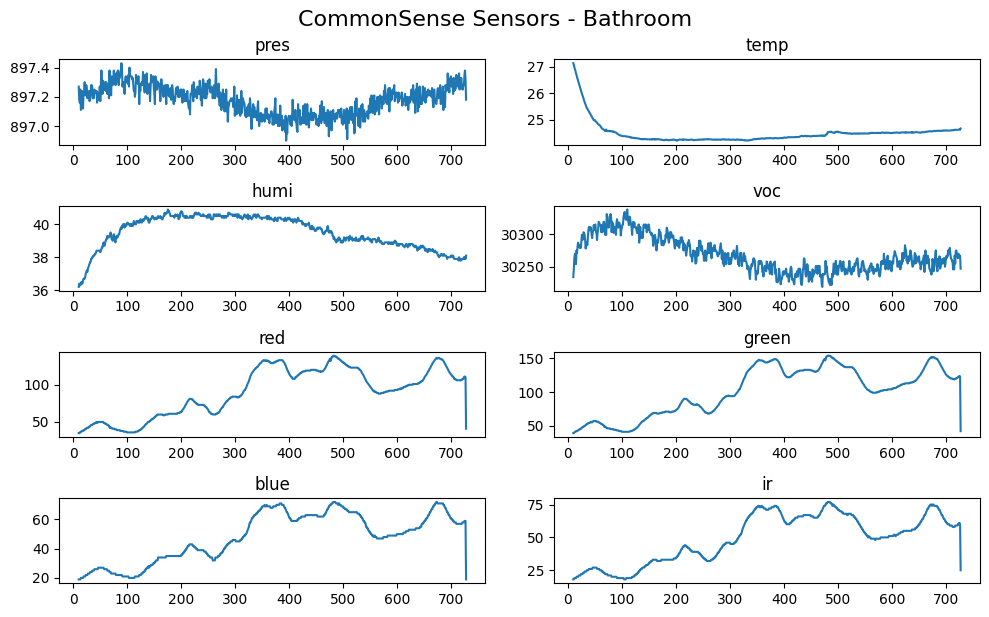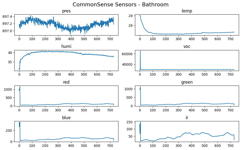 The data logger will capture data from the eight sensors (pressure, temperature, humidity, VOC, light-red, light-green, light-blue, and IR). I have captured around two hours of data (one sample every 10 seconds) in each housing area (Laboratory, Bathroom, Kitchen, and Service Area). The CommonSense device worked offline and was powered by a 5V Powerbank as shown below:
