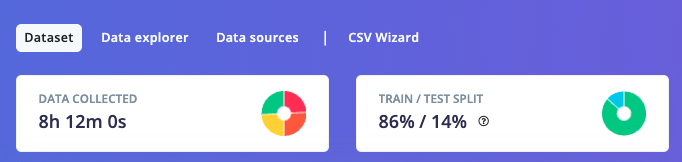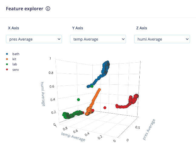 As we did before, we should upload the curated data to the Studio using the “CSV Wizard” tool. Now, we will upload 2 separate files, Train and Data. When we saved the .csv file, we did not include a timeStamp (or count) column, so on the CSV Wizard, we should inform the sampled frequency (in our case, 0.1Hz). I also left it to the Studio to define the labels, informing where they were located (column “class”). For the Impulse, I considered a window of 3 samples (here 3,000 ms) with a slice of 1 sample (1,000 ms). As a Processing Block, “Flatten” was chosen; as this block changes an axis into a single value, it is helpful for slow-moving averages like the data we are capturing. For Learning, we will use “Classification” and Anomaly Detection (this one only for testing). The main difference now, after we upload the files, is that the total Data collected time will show more than 8 hours, which is correct once I captured around 2 hours in each of my home rooms.
