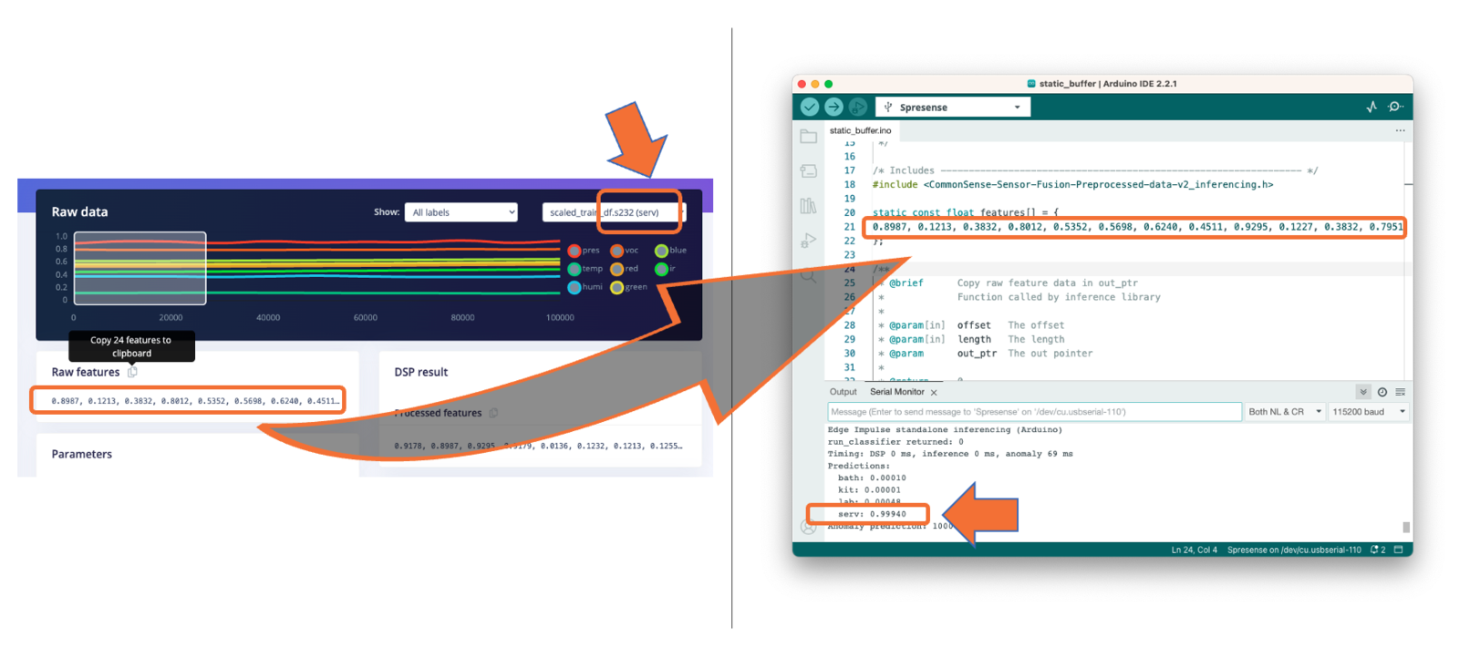 To start, let’s run the Static Buffer example. For that, we should select one Raw sample as our model input tensor (in our case, a data point from the Service Room (class: serv). This value should pasted on the line: