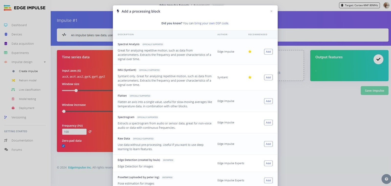 Click Add to add the Spectral Analysis Processing block to your Impulse.