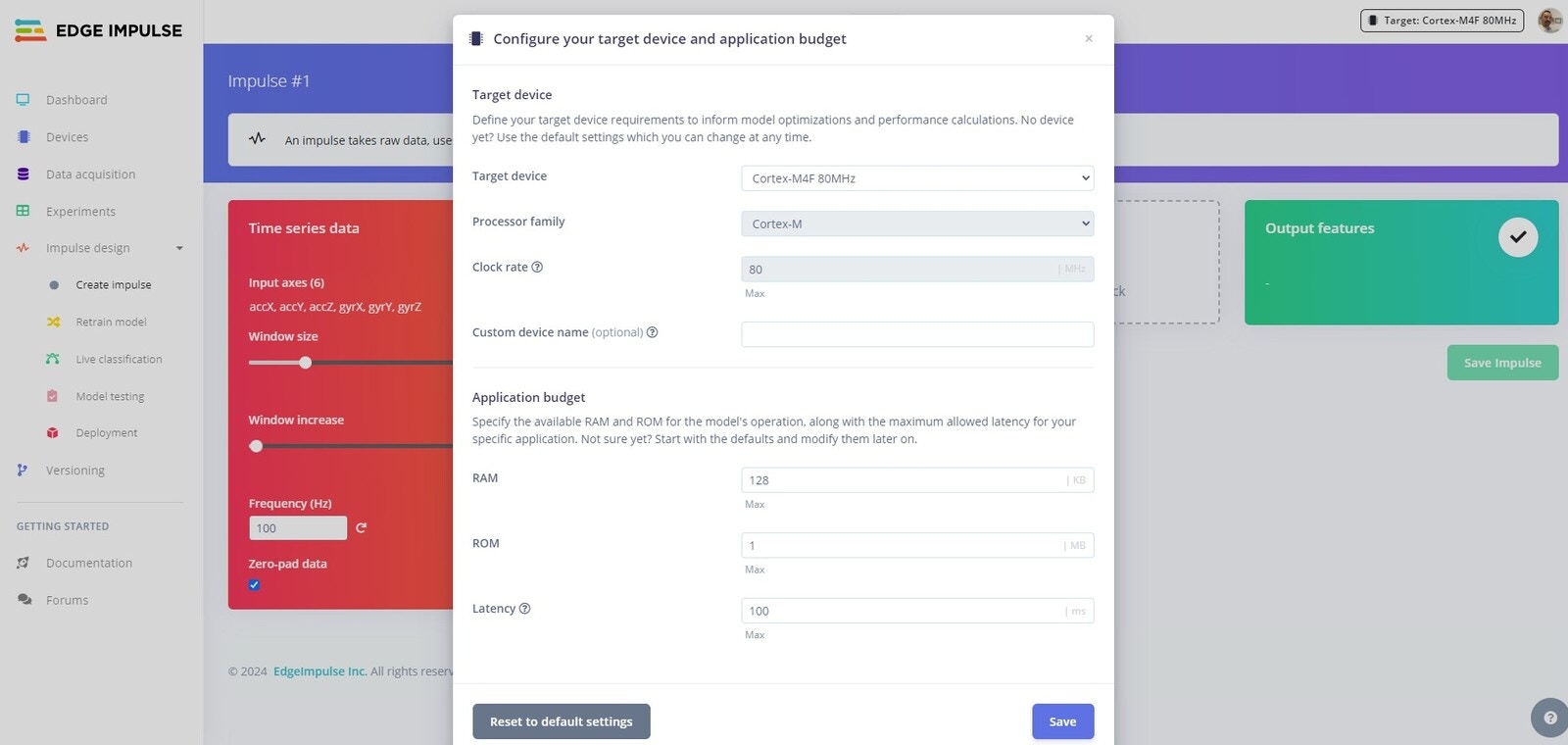 Create Impulse tab and you should see the configuration for your Nano RPI2040. You can accept the defaults here.