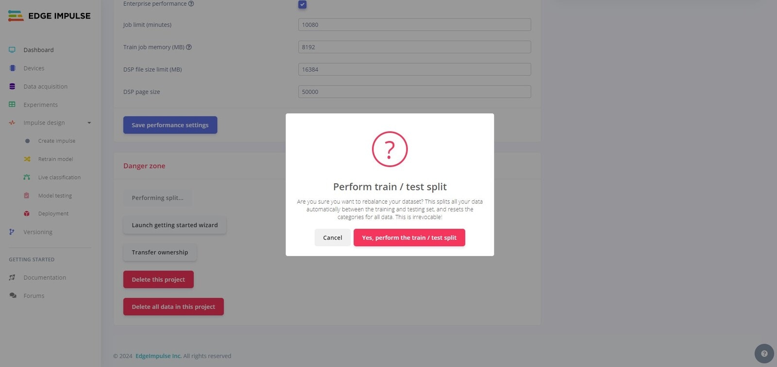 Danger Zone at the bottom. Click on the Perform train/test split button to split the data.