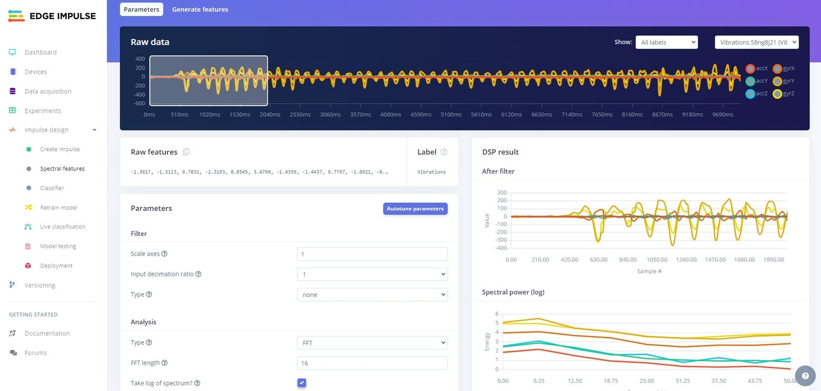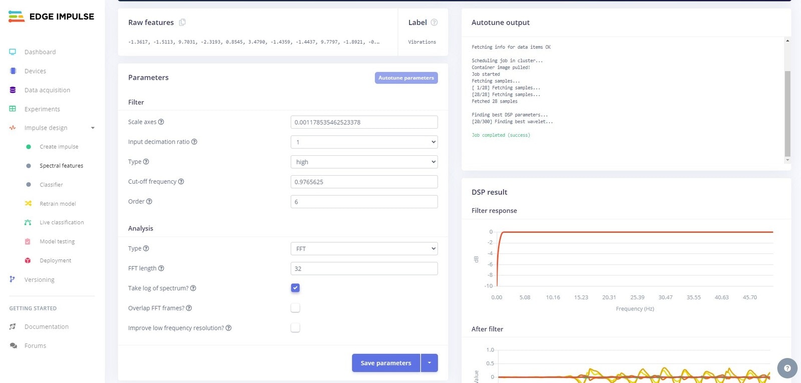 Spectral Features tab and click on Autotune parameters. An autotune job will start and you will see the output on the right hand side of the UI.