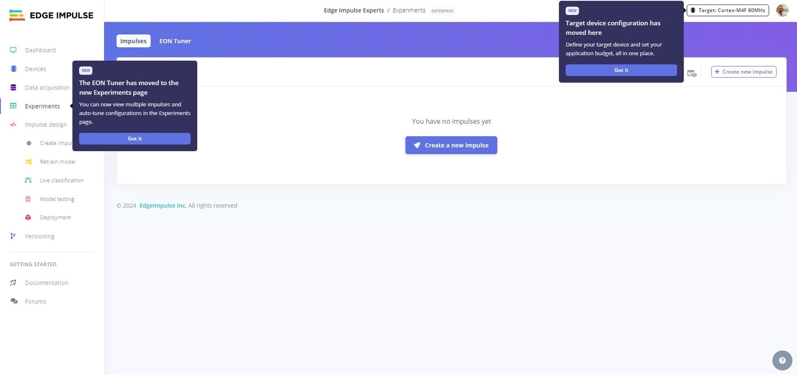 As this tutorial is specifically related to Experiments, we will continue straight to EON Tuner and creating our next Experiment.