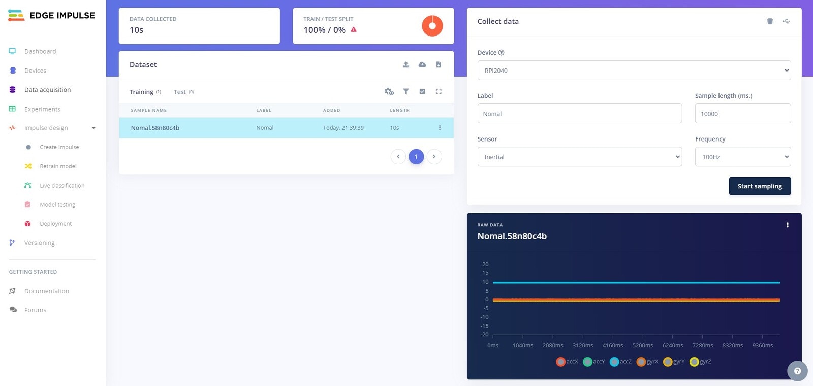 normal data. This data will represent when a machine is running normally with no abnormal vibrations. Select the Intertial sensor and use Normal as the label. Next record about 3 minutes data, collected in 10 second samples from the device.