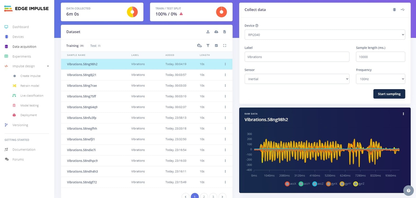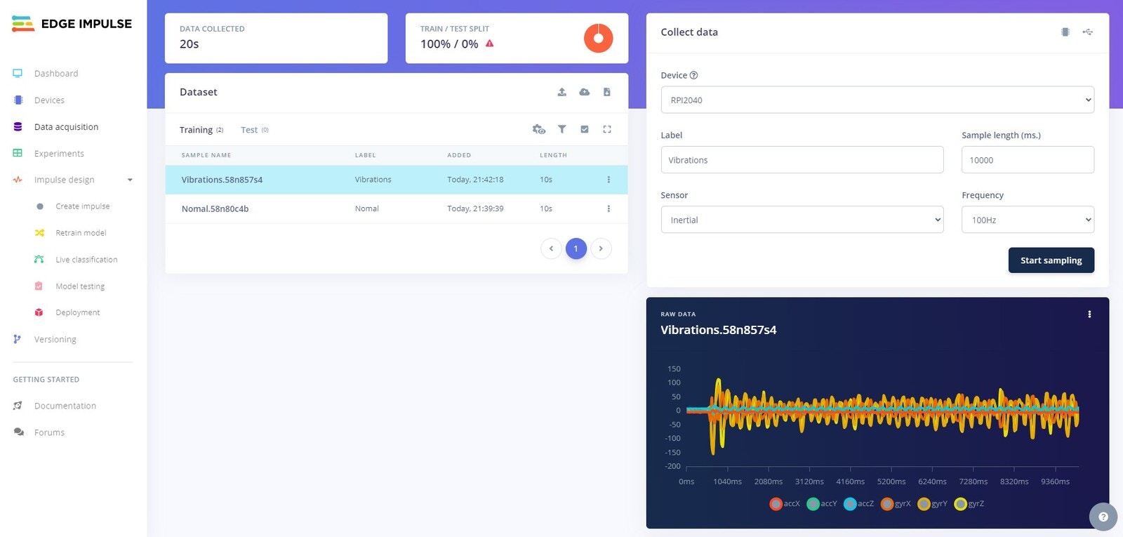 Edge Impulse Project Collect Vibrations Data